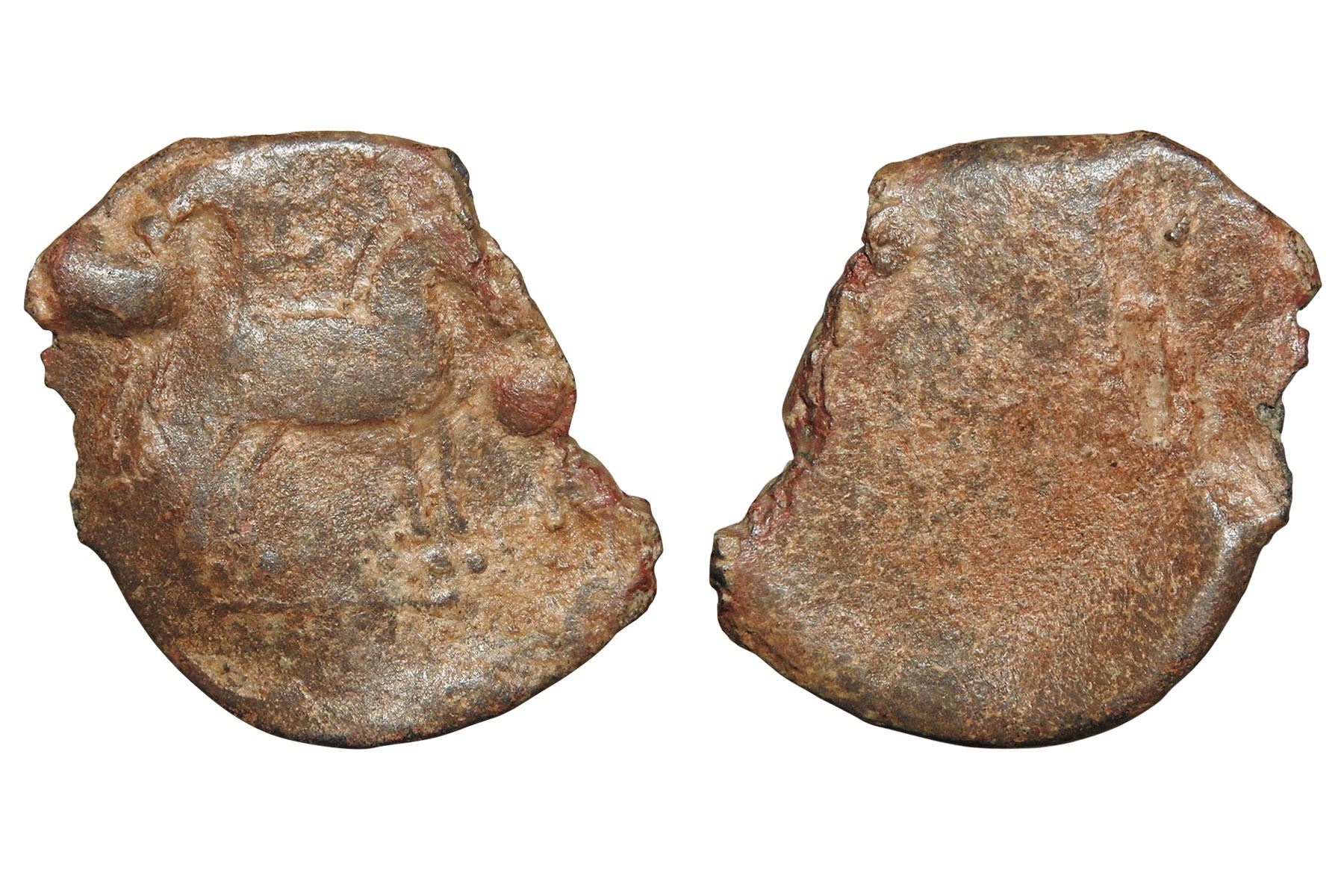 Hiranyakas of Rayalseema, 300 AD, Lead unit, 9.80 grams, 28.69mm x 22.82mm, Obverse: Two horses to right (double struck?) on a platform and facing a circular object, Shrivatsa above, Reverse: Plain/effaced, Fine to Very Fine, Very Rare, Reference: Pieper page 341, Unlisted variety.