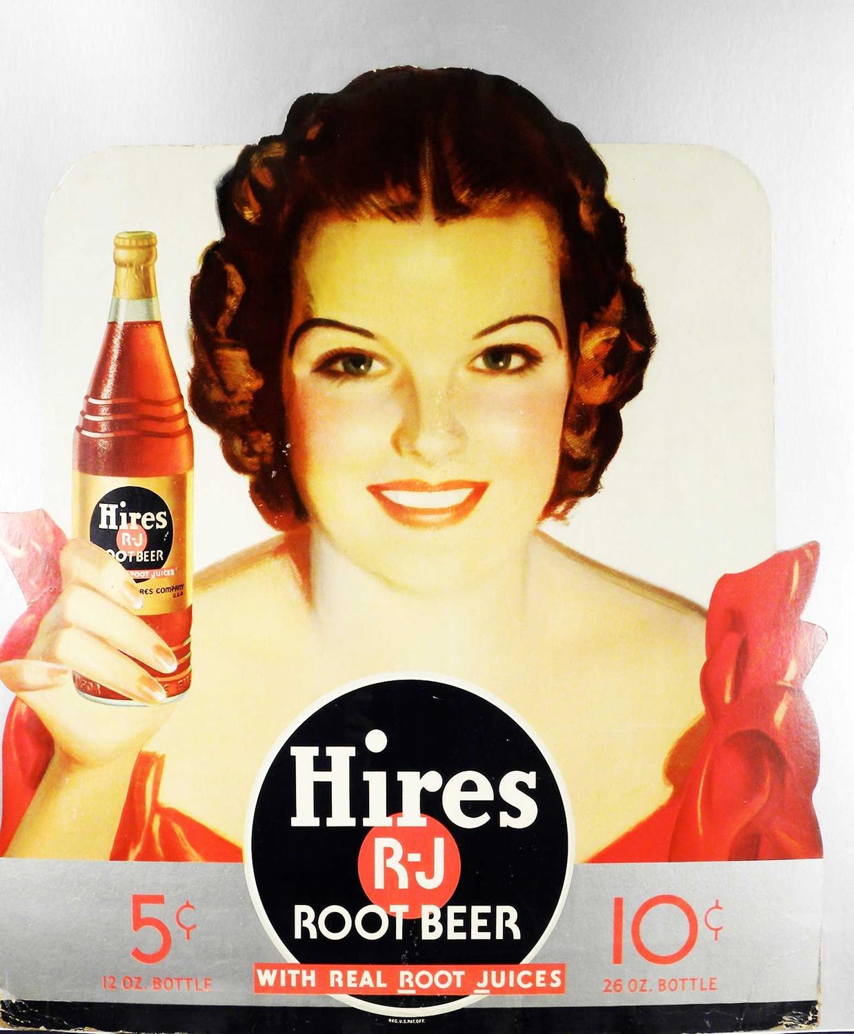Hires Root Beer Die Cut Cardboard Easel Back Sign. Entitled, "With real root juices". Framed under glass. Some light staining, dog eared bottom corners, crease at 5/9:00 otherwise very good condition. 30 X 33 inches.