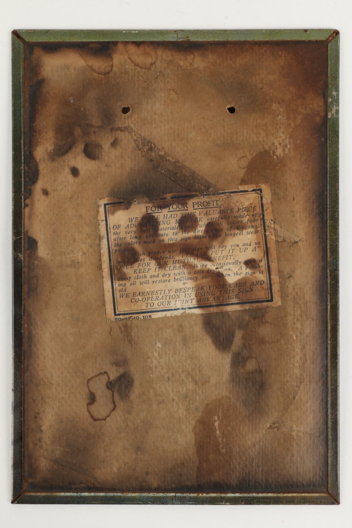 American. Circa 1910. Lithographed tin-over-cardboard. Marked, "Stelad Signs, Passaic Metal Ware Co. Passaic NJ". Original paper label, rear. 9.25" x 6.5". Light surface scratches, fading. $300-500.