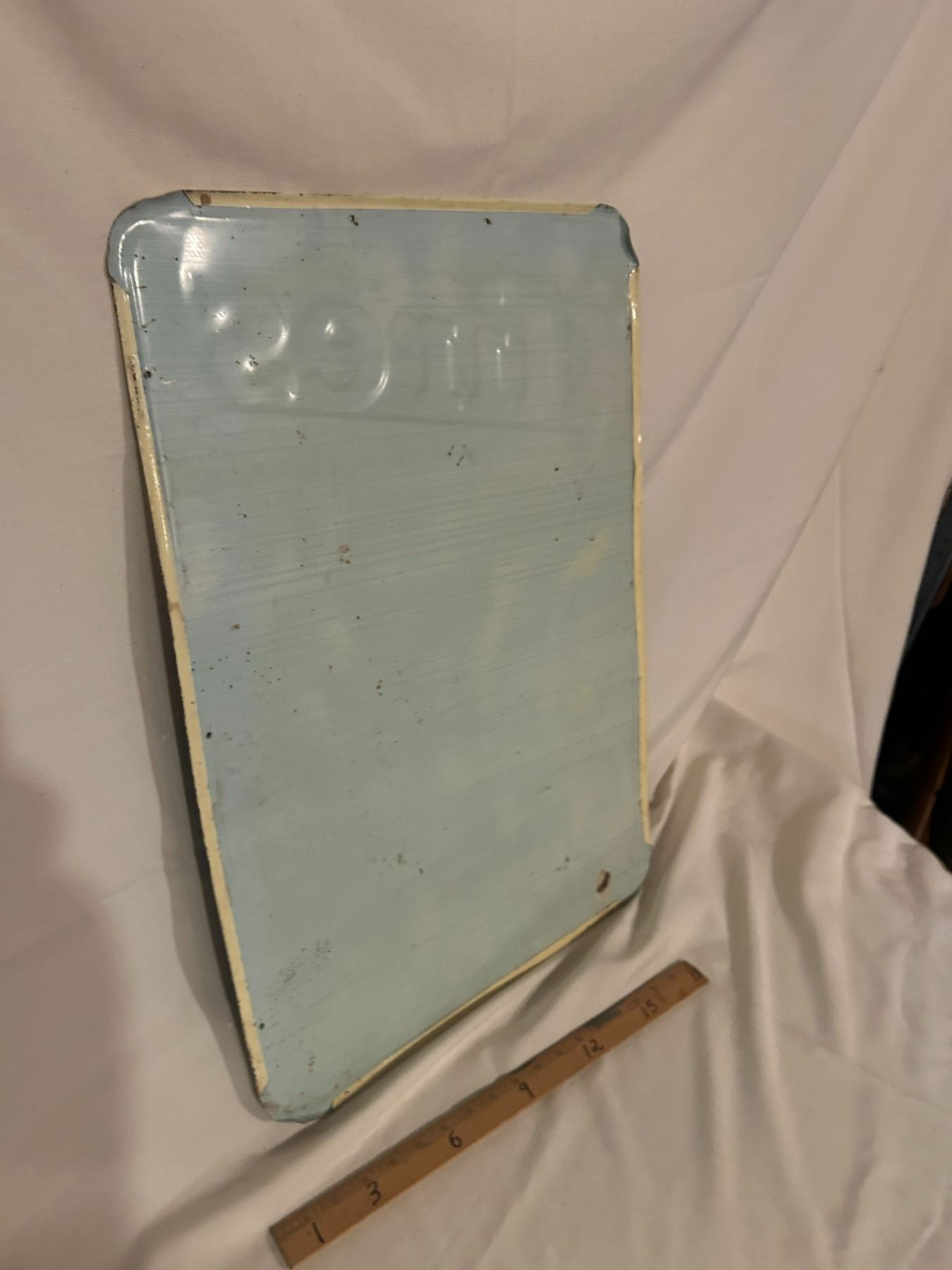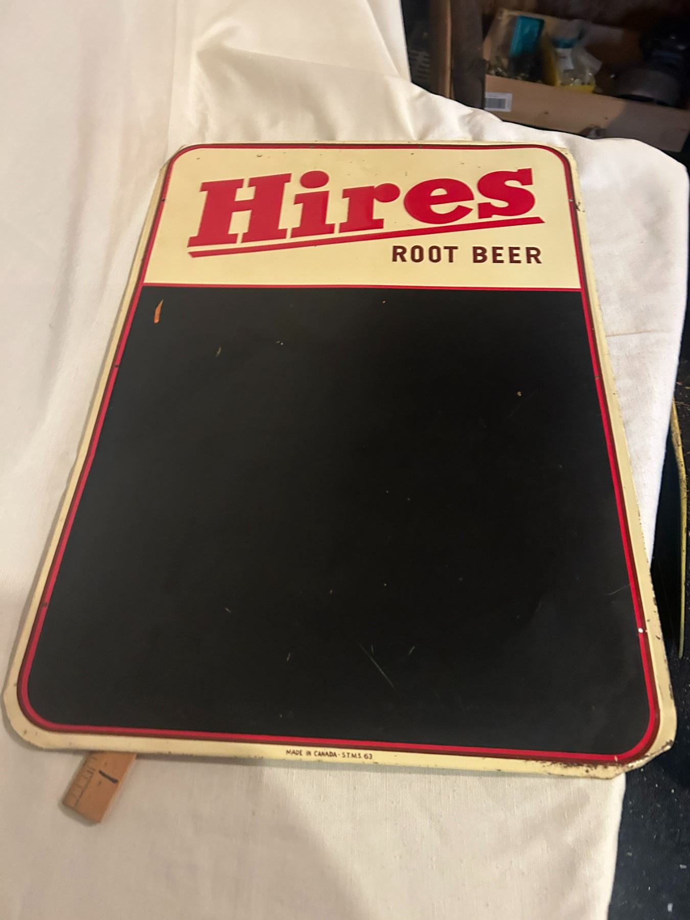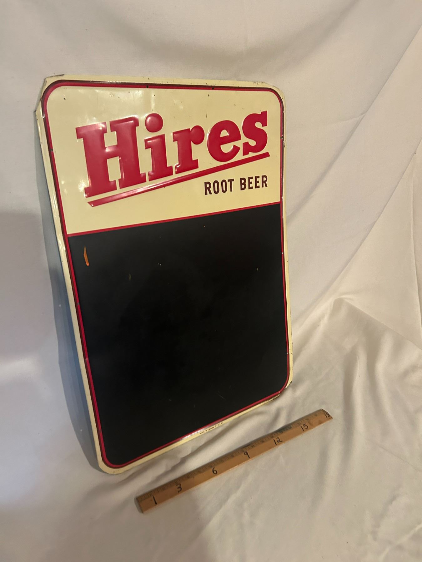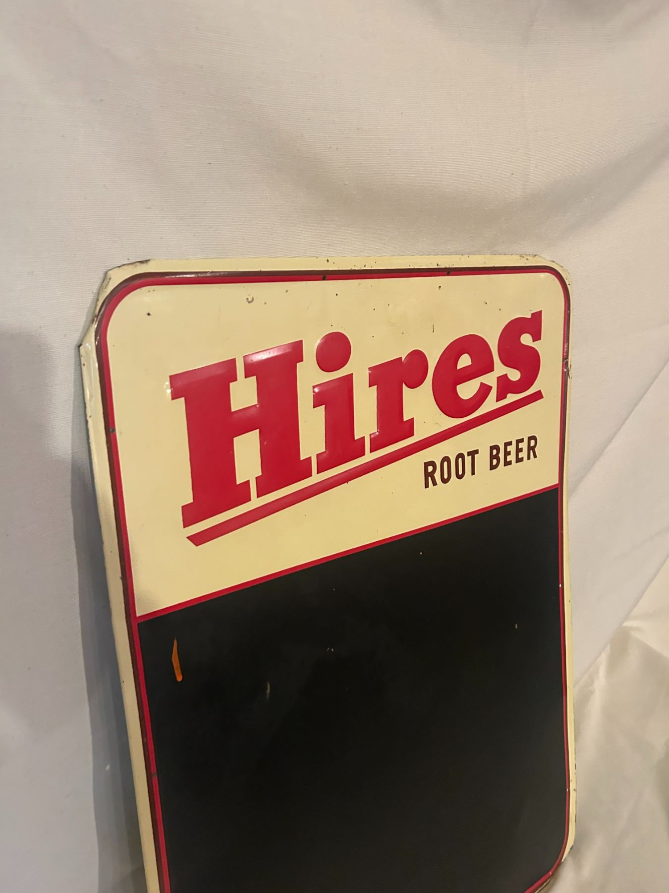Hires Root Beer tin menu board sign - embossed, stamped 1963, 27"x19"