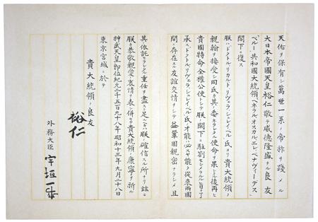Excessively rare war-dated letter signed by the Emperor of Japan Hirohito, and countersigned by Prince Fumimaro Konoye. From Tokyo dated 1939, Hirohito writes a letter of diplomacy to Peruvian President Oscar Benavides. Gold-trimmed two-page folio letter in Japanese kanji is accompanied by an original printed letter on official Imperial Japanese paper translating the document into French. Letter is moderately toned, with beautiful trim and calligraphy and a superb signature. Evidence of mounting on borders of verso, overall very good condition.