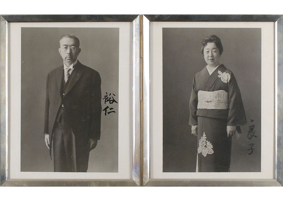 Emperor of Japan (born 1901) from 1926 to his death in 1989. Following the devastating result of the atomic bombs dropped on Nagasaki and Hiroshima in World War II, he renounced his divinity in favor of a democratic constitutional monarchy. Incredibly scarce set of vintage 6 x 9.25 three-quarter length portraits of Hirohito and Empress Nagako, beautifully signed in thick black ink, in Japanese, by the emperor and empress. Photos are presented in a pair of hinged 8.25 x 10.5 frames. In fine condition. Portraits were originally presented to Eigil Nygaard, Norway’s ambassador to Japan. Few Hirohito portraits are made available to the collecting public, particularly in photos of this quality.