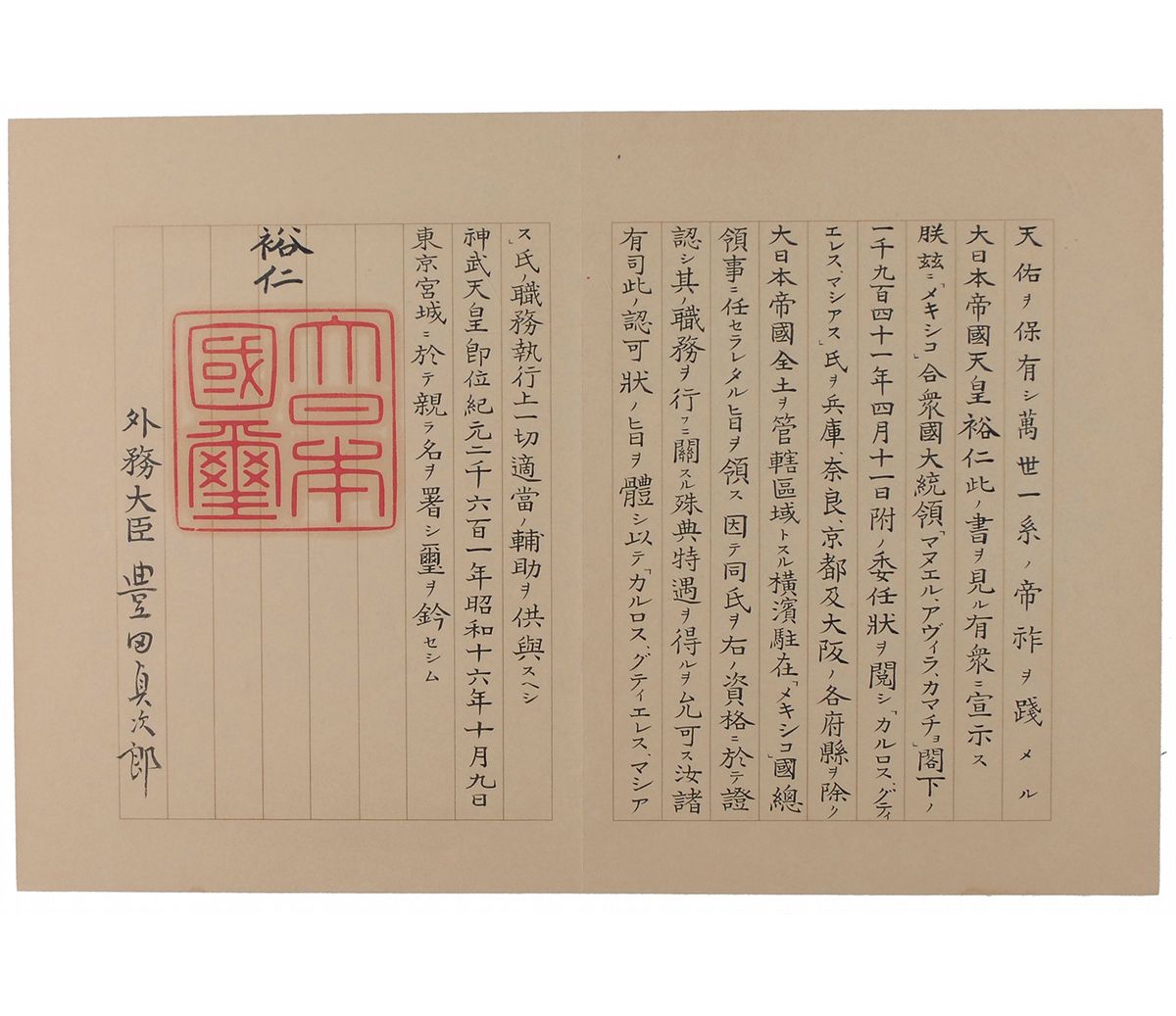 Having examined the officially recognized letters dated April 11, 1941 from His Excellency Mr. Manuel Avila Camacho, President of the United States of Mexico, by which [the letters] he has named Mr. Carlos Gutierrez Macias Consul General of Mexico at Yokohama, with consular jurisdiction over all Japan Empire, at the exception of Hyogo, Nara, Kyoto and Osaka Prefectures, We have recognized him in such and We have granted him all privileges relative to his duties. We consequently order to the proper Authorities to give to Mr. Carlos Gutierrez Macias all necessary assistance in the exercise of his duties, in accordance to the present exequatur.