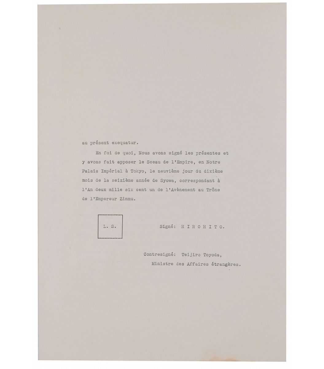 Witness my hand and official Empire seal, in our Imperial Palace in Tokyo, this ninth day of the tenth month of the sixteenth Showa year, corresponding to year two thousand six-hundred one of enthroned Emperor Jimmu.” Signed at the conclusion by Hirohito, and countersigned by Minister of Foreign Affairs, Teijiro Toyoda. In fine, bright condition, and accompanied by a French translation and its original envelope.