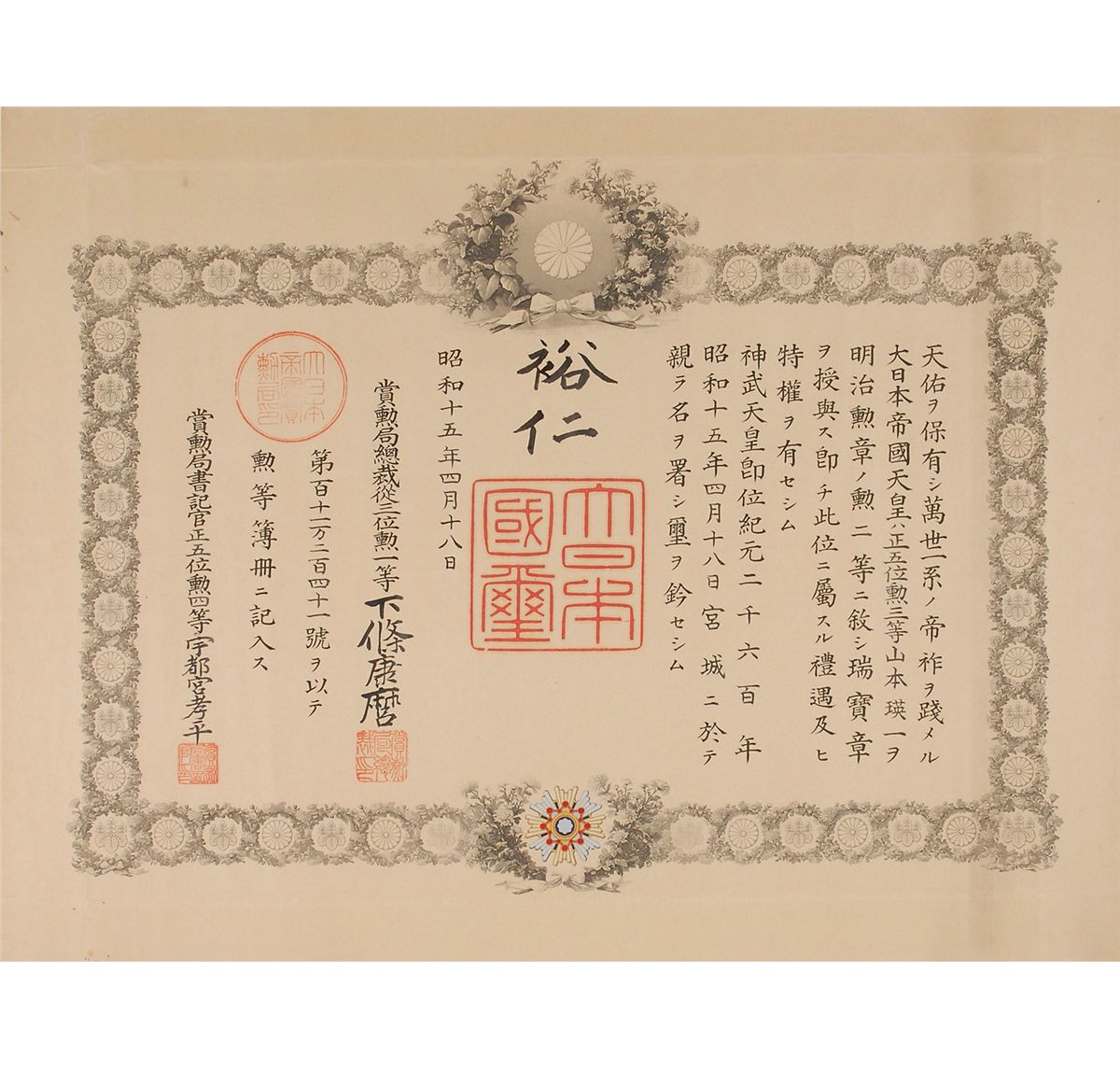 Incredibly rare manuscript DS in Japanese, one page, 23.5 x 18, April 18, 1940. Document in which the Emperor of Japan confers the Imperial Order of Meiji upon Eiichi Yamamoto. In full (translated): “By the grace of Heaven, Emperor of Japan, seated on the throne with unbroken imperial line, hereby confers the Second Class of the Imperial Order of Meiji upon Eiichi Yamamoto who is currently decorated with Senior Fifth Rank and the Third Order of Merit, and invests him with the insignia of the Order of the Sacred Treasure, Gold and Silver Star, granting him with the benefits and privileges associated with this rank and honor. I have set my hand and caused the seal of the Empire of Japan to be affixed at the Imperial Palace, Tokyo, this 18th day of April, 1940.” Boldly signed by Hirohito and countersigned by Yasumaro Shimojo, Junior Third Rank, the First Order of Merit, Director of the Decoration Bureau and by Kohei Utsunomiya, Senior Fifth Rank, the Fourth Order of Merit, Clerk of the Decoration Bureau. In fine condition, with folds around the perimeter of the document and some scattered light creases.