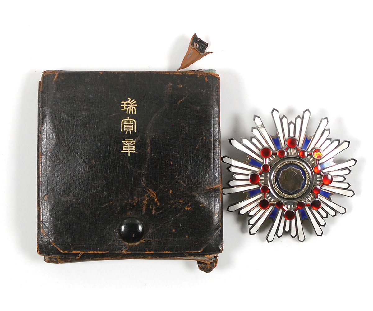 Included is the Star of the Order of the Sacred Treasure, 2.75” diameter, presented to Eiichi Yamamoto. “Kunko Seisho” is engraved on the reverse of the badge, which identifies it as praising achievement. Award is housed in its original 4 x 4 leather and felt case, gilt-imprinted on the cover that it is the Order of the Sacred Treasure, with the case showing expected minor wear. The insignia of the order incorporates symbols for the three imperial treasures: the Yata Mirror, so sacred that not even the Emperor is allowed to look at it; the Yasakani Jewel, made of the finest jade; and the Emperor’s personal Sword. White enameled rays represent the sword (slight chip on one of the 40 rays). The central disc bearing an eight-pointed silver star represents the mirror, surrounded by a wreath with red-enameled dots (one with slight chip) representing the jewel.