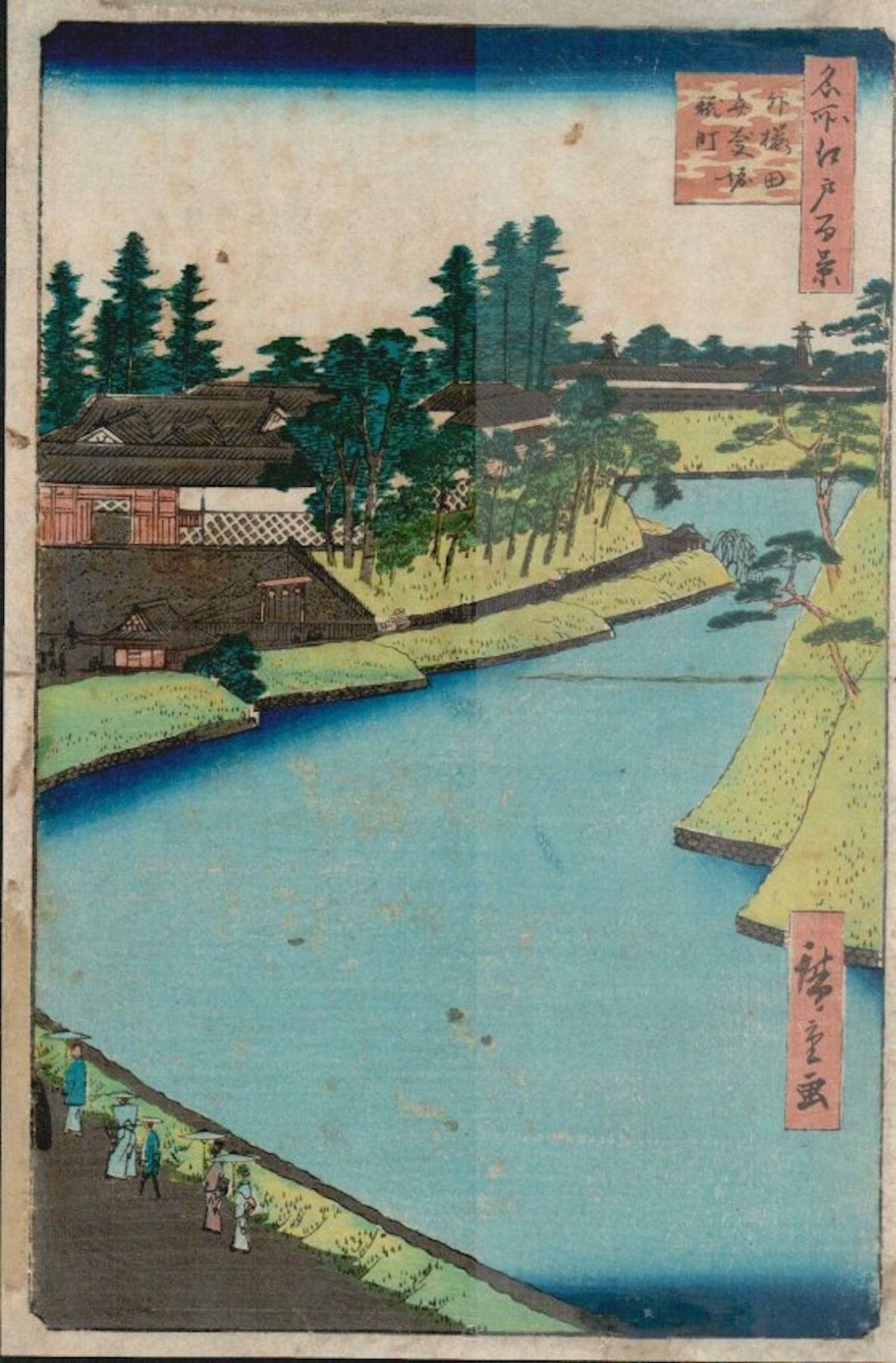 Hiroshige - "100 FAMOUS VIEWS OF EDO 1987", BIRDS EYE VIEW OF A CANAL, CIRCA 1857, GOOD COLOR AND IMPRESSION. MARGINS SLIGHTLY TRIMMED, AND SOILED, STAINED, BACKED, OBAN, TATE-E. MEASURES AT 14 X 9 1/4