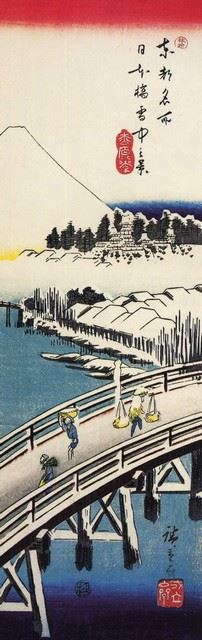 Artist: Utagawa Hiroshige - Title: A Bridge in the Snow - Medium: Fine Art Giclee on Canvas - Image Size: Approximately 20 inches x 6.25 inches - Unframed on Unstretched Canvas - Biography: (1797 - 12 October 1858) Hiroshige 's print s convey the beauty of Japan and provide insight into the everyday life of its citizens during the Edo period. The appeal of his tender, lyrical landscapes was not restricted to the Japanese audience.Hiroshige 's work had a profound influence on the Impressionists and Post-Impressionists of Europe: Toulouse-Lautrec was fascinated withHiroshige 's daring diagonal compositions and inventive use of perspective, while Van Gogh literally copied two ofHiroshig's prints from the famous series, 100 Famous Views of Edo in oil paint. - The borders may not be even inHiroshig's images. Please refer to the image.