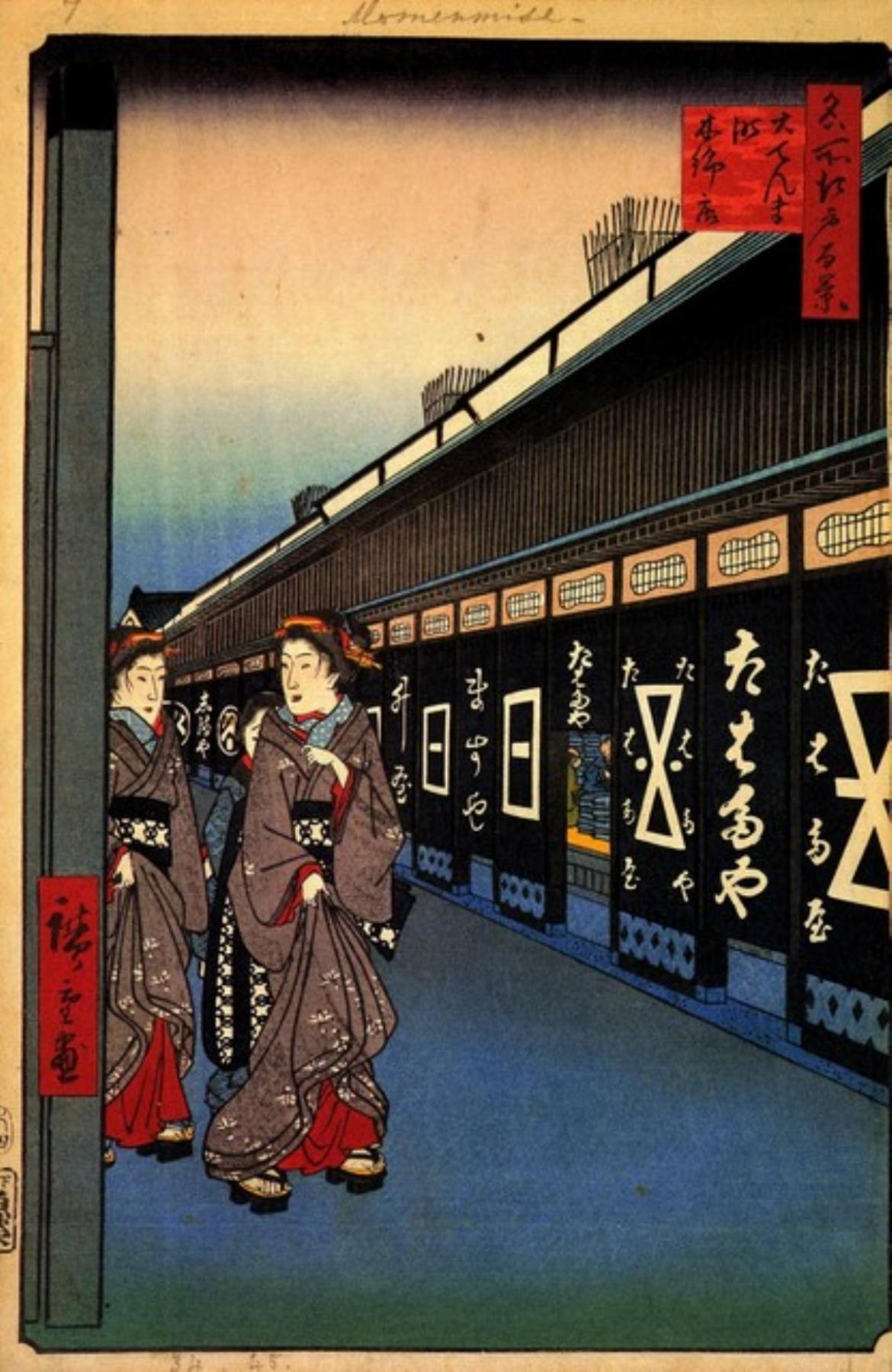 Artist: Utagawa Hiroshige - Title: Cotton-Goods Lane - Medium: Fine Art Giclee on Canvas - Image Size: Approximately 20 inches x 12.75 inches - Unframed on Unstretched Canvas - Biography: (1797 - 12 October 1858) Hiroshige 's prints convey the beauty of Japan and provide insight into the everyday life of its citizens during the Edo period. The appeal of his tender, lyrical landscapes was not restricted to the Japanese audience.Hiroshige 's work had a profound influence on the Impressionists and Post-Impressionists of Europe: Toulouse-Lautrec was fascinated withHiroshige 's daring diagonal compositions and inventive use of perspective, while Van Gogh literally copied two ofHiroshig's prints from the famous series, 100 Famous Views of Edo in oil paint. - The borders may not be even inHiroshig's images. Please refer to the image.