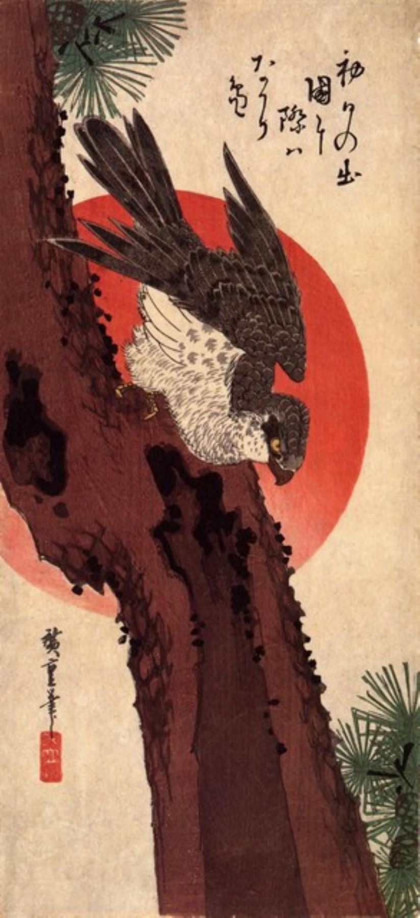 Artist: Utagawa Hiroshige - Title: Falcon on Pine with Rising Sun - Medium: Fine Art Giclee on Canvas - Image Size: Approximately 20 inches x 9 inches - Unframed on Unstretched Canvas - Biography: (1797 - 12 October 1858) Hiroshige 's print s convey the beauty of Japan and provide insight into the everyday life of its citizens during the Edo period. The appeal of his tender, lyrical landscapes was not restricted to the Japanese audience.Hiroshige 's work had a profound influence on the Impressionists and Post-Impressionists of Europe: Toulouse-Lautrec was fascinated withHiroshige 's daring diagonal compositions and inventive use of perspective, while Van Gogh literally copied two ofHiroshig's prints from the famous series, 100 Famous Views of Edo in oil paint. - The borders may not be even inHiroshig's images. Please refer to the image.