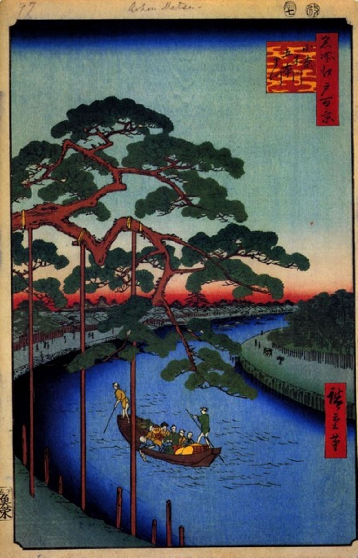 Artist: Utagawa Hiroshige - Title: Five Pines - Medium: Fine Art Giclee on Canvas - Image Size: Approximately 32 inches x 20.5 inches - Unframed on Unstretched Canvas - Biography: (1797 - 12 October 1858) Hiroshige 's prints convey the beauty of Japan and provide insight into the everyday life of its citizens during the Edo period. The appeal of his tender, lyrical landscapes was not restricted to the Japanese audience.Hiroshige 's work had a profound influence on the Impressionists and Post-Impressionists of Europe: Toulouse-Lautrec was fascinated withHiroshige 's daring diagonal compositions and inventive use of perspective, while Van Gogh literally copied two ofHiroshig's prints from the famous series, 100 Famous Views of Edo in oil paint. - The borders may not be even inHiroshig's images. Please refer to the image.