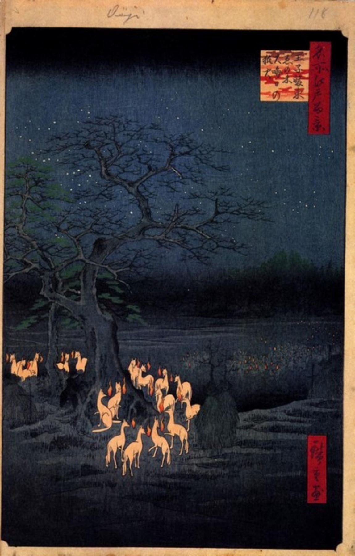 Artist: Utagawa Hiroshige - Title: Foxfires at the Changing Tree - Medium: Fine Art Giclee on Canvas - Image Size: Approximately 20 inches x 12.75 inches - Unframed on Unstretched Canvas - Biography: (1797 - 12 October 1858) Hiroshige 's print s convey the beauty of Japan and provide insight into the everyday life of its citizens during the Edo period. The appeal of his tender, lyrical landscapes was not restricted to the Japanese audience.Hiroshige 's work had a profound influence on the Impressionists and Post-Impressionists of Europe: Toulouse-Lautrec was fascinated withHiroshige 's daring diagonal compositions and inventive use of perspective, while Van Gogh literally copied two ofHiroshig's prints from the famous series, 100 Famous Views of Edo in oil paint. - The borders may not be even inHiroshig's images. Please refer to the image.