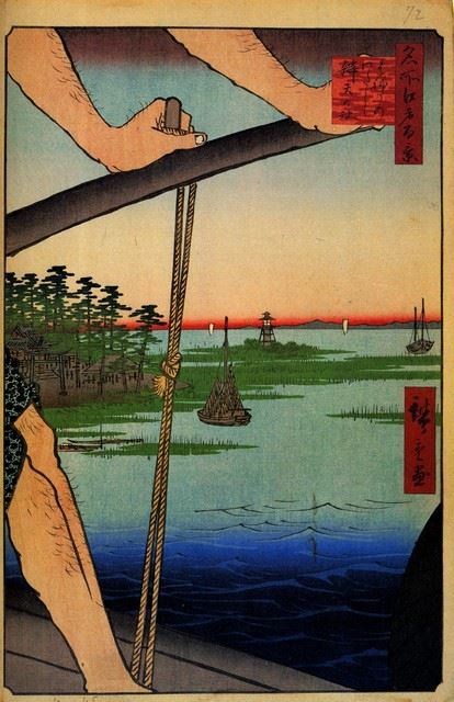 Artist: Utagawa Hiroshige   - Title:  Haneda Ferry and Benten Shrine   - Medium: Fine Art Giclee on Canvas - Image Size: Approximately 32 inches x 20.5 inches -  Unframed on Unstretched Canvas - Biography: (1797 - 12 October 1858) Hiroshige 's prints convey the beauty of Japan and provide insight into the everyday life of its citizens during the Edo period. The appeal of his tender, lyrical landscapes was not restricted to the Japanese audience.Hiroshige 's work had a profound influence on the Impressionists and Post-Impressionists of Europe: Toulouse-Lautrec was fascinated withHiroshige 's daring diagonal compositions and inventive use of perspective, while Van Gogh literally copied two ofHiroshig's prints from the famous series, 100 Famous Views of Edo in oil paint.  -  The borders may not be even inHiroshig's images.  Please refer to the image.