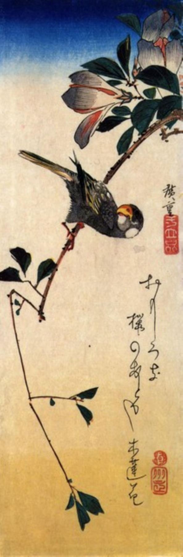 Artist: Utagawa Hiroshige - Title: Java Sparrow and Magnolia - Medium: Fine Art Giclee on Canvas - Image Size: Approximately 20 inches x 6.5 inches - Unframed on Unstretched Canvas - Biography: (1797 - 12 October 1858) Hiroshige 's print s convey the beauty of Japan and provide insight into the everyday life of its citizens during the Edo period. The appeal of his tender, lyrical landscapes was not restricted to the Japanese audience.Hiroshige 's work had a profound influence on the Impressionists and Post-Impressionists of Europe: Toulouse-Lautrec was fascinated withHiroshige 's daring diagonal compositions and inventive use of perspective, while Van Gogh literally copied two ofHiroshig's prints from the famous series, 100 Famous Views of Edo in oil paint. - The borders may not be even inHiroshig's images. Please refer to the image.