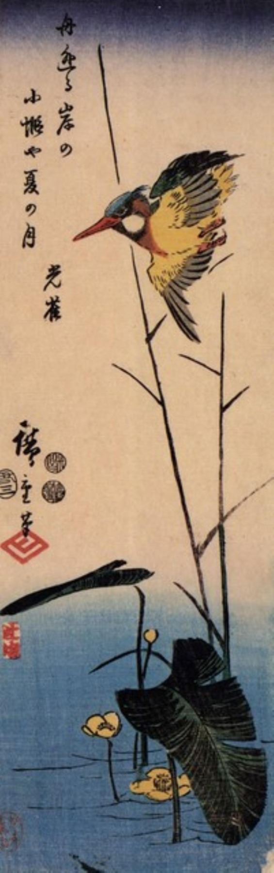 Artist: Utagawa Hiroshige - Title: Kingfisher Over Yellow Water Plant 2 - Medium: Fine Art Giclee on Canvas - Image Size: Approximately 32 inches x 10 inches - Unframed on Unstretched Canvas - Biography: (1797 - 12 October 1858) Hiroshige 's print s convey the beauty of Japan and provide insight into the everyday life of its citizens during the Edo period. The appeal of his tender, lyrical landscapes was not restricted to the Japanese audience.Hiroshige 's work had a profound influence on the Impressionists and Post-Impressionists of Europe: Toulouse-Lautrec was fascinated withHiroshige 's daring diagonal compositions and inventive use of perspective, while Van Gogh literally copied two ofHiroshig's prints from the famous series, 100 Famous Views of Edo in oil paint. - The borders may not be even inHiroshig's images. Please refer to the image.