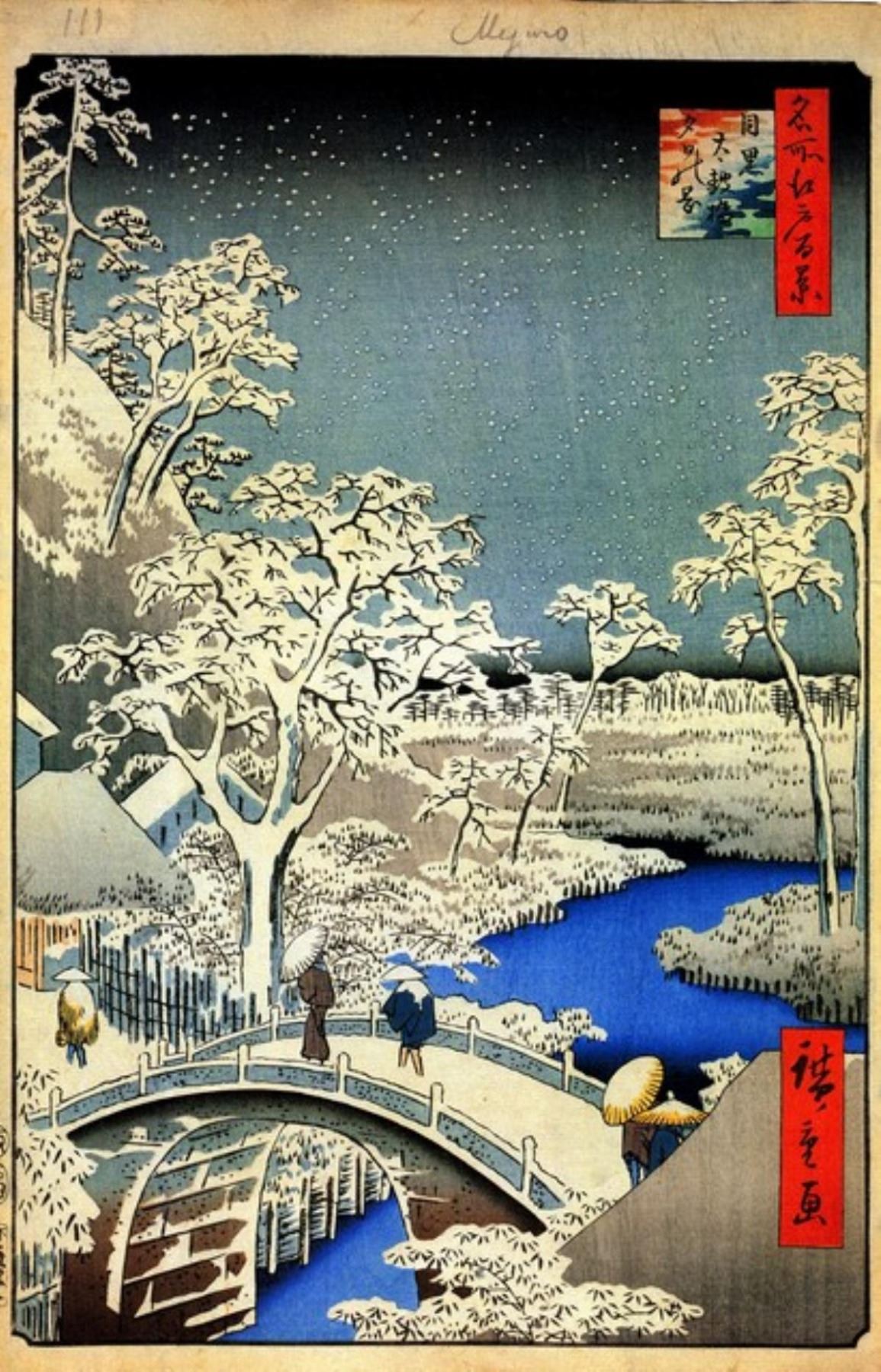 Artist: Utagawa Hiroshige - Title: Meguro Drum Bridge - Medium: Fine Art Giclee on Canvas - Image Size: Approximately 32 inches x 20.5 inches - Unframed on Unstretched Canvas - Biography: (1797 - 12 October 1858) Hiroshige 's print s convey the beauty of Japan and provide insight into the everyday life of its citizens during the Edo period. The appeal of his tender, lyrical landscapes was not restricted to the Japanese audience.Hiroshige 's work had a profound influence on the Impressionists and Post-Impressionists of Europe: Toulouse-Lautrec was fascinated withHiroshige 's daring diagonal compositions and inventive use of perspective, while Van Gogh literally copied two ofHiroshig's prints from the famous series, 100 Famous Views of Edo in oil paint. - The borders may not be even inHiroshig's images. Please refer to the image.
