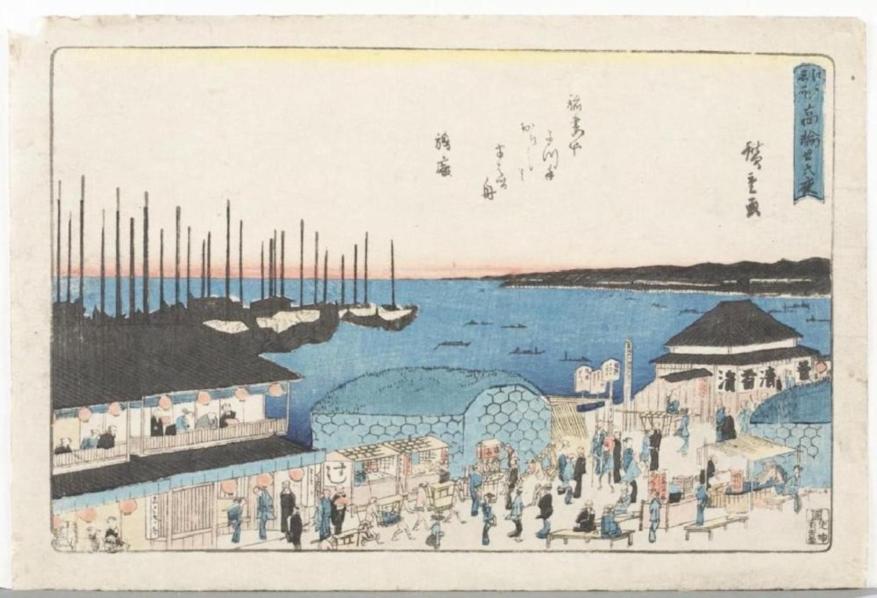 Utagawa, Hiroshige (Japan, 1797-1858). Moon Viewing at Takanawa on the Night of the Twenty-sixth (Takanawa Nijuurokuya), from the series Famous Places in Edo (Edo meisho). 1844. Oban, approx. 15"h x 10"w. From the collection of diplomat T. Kobayashi. FINE CONDITION