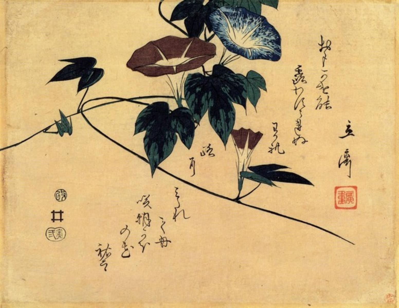 Artist: Utagawa Hiroshige - Title: Morning Glory - Medium: Fine Art Giclee on Canvas - Image Size: Approximately 15.5 inches x 20 inches - Unframed on Unstretched Canvas - Biography: (1797 - 12 October 1858) Hiroshige 's print s convey the beauty of Japan and provide insight into the everyday life of its citizens during the Edo period. The appeal of his tender, lyrical landscapes was not restricted to the Japanese audience.Hiroshige 's work had a profound influence on the Impressionists and Post-Impressionists of Europe: Toulouse-Lautrec was fascinated withHiroshige 's daring diagonal compositions and inventive use of perspective, while Van Gogh literally copied two ofHiroshig's prints from the famous series, 100 Famous Views of Edo in oil paint. - The borders may not be even inHiroshig's images. Please refer to the image.