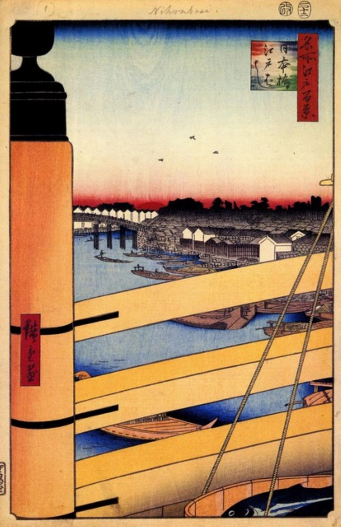 Artist: Utagawa Hiroshige   - Title:  Nihonbashi Bridge   - Medium: Fine Art Giclee on Canvas - Image Size: Approximately 32 inches x 20.75 inches -  Unframed on Unstretched Canvas - Biography: (1797 - 12 October 1858) Hiroshige 's prints convey the beauty of Japan and provide insight into the everyday life of its citizens during the Edo period. The appeal of his tender, lyrical landscapes was not restricted to the Japanese audience.Hiroshige 's work had a profound influence on the Impressionists and Post-Impressionists of Europe: Toulouse-Lautrec was fascinated withHiroshige 's daring diagonal compositions and inventive use of perspective, while Van Gogh literally copied two ofHiroshig's prints from the famous series, 100 Famous Views of Edo in oil paint.  -  The borders may not be even inHiroshig's images.  Please refer to the image.