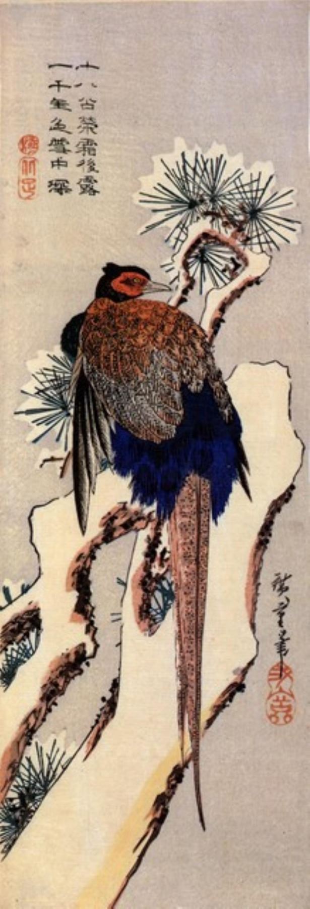 Artist: Utagawa Hiroshige - Title: Pheasant on Snow Coverd Pine - Medium: Fine Art Giclee on Canvas - Image Size: Approximately 20 inches x 6.75 inches - Unframed on Unstretched Canvas - Biography: (1797 - 12 October 1858) Hiroshige 's print s convey the beauty of Japan and provide insight into the everyday life of its citizens during the Edo period. The appeal of his tender, lyrical landscapes was not restricted to the Japanese audience.Hiroshige 's work had a profound influence on the Impressionists and Post-Impressionists of Europe: Toulouse-Lautrec was fascinated withHiroshige 's daring diagonal compositions and inventive use of perspective, while Van Gogh literally copied two ofHiroshig's prints from the famous series, 100 Famous Views of Edo in oil paint. - The borders may not be even inHiroshig's images. Please refer to the image.