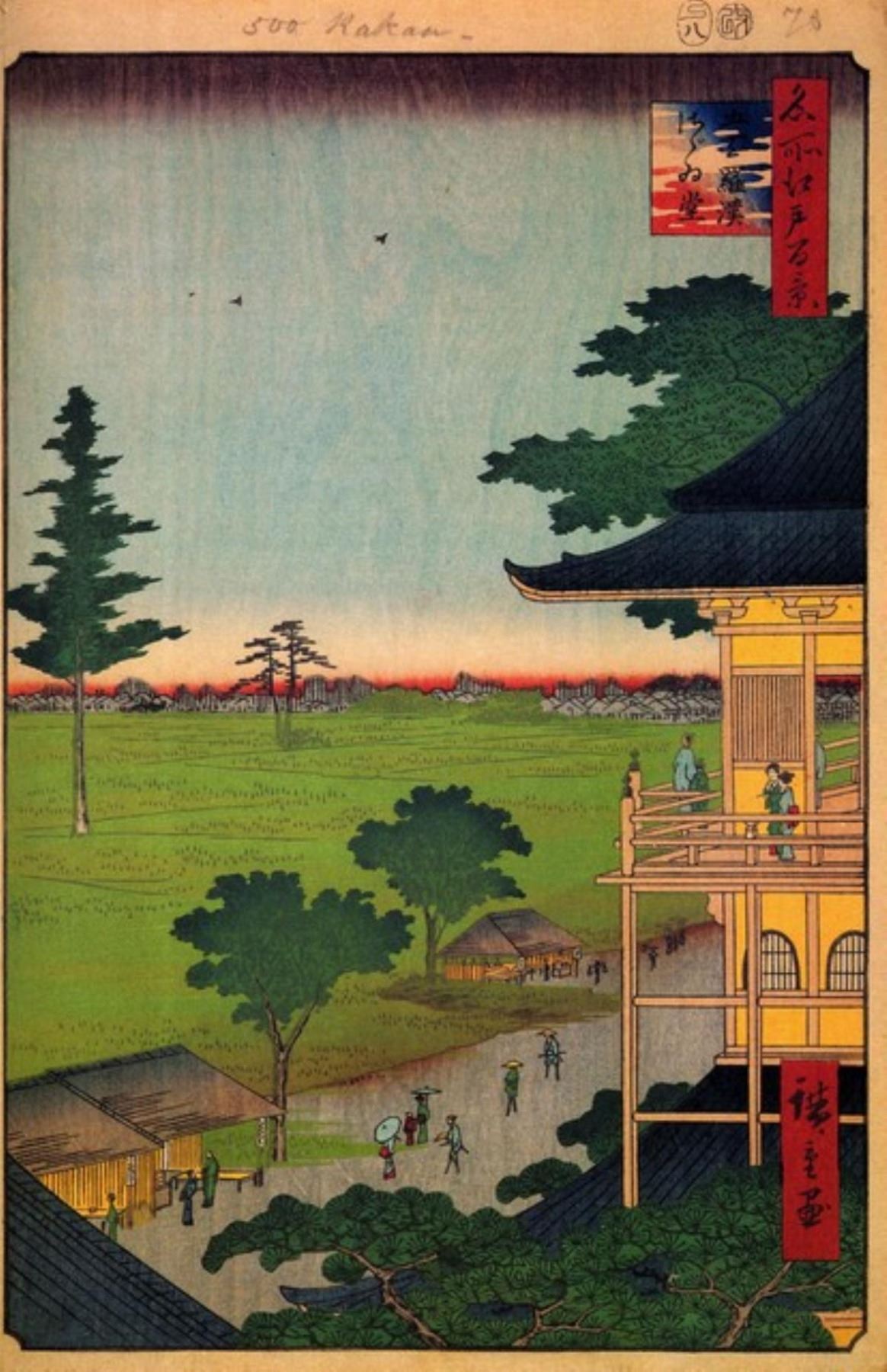 Artist: Utagawa Hiroshige - Title: Rakan Temple - Medium: Fine Art Giclee on Canvas - Image Size: Approximately 32 inches x 20.75 inches - Unframed on Unstretched Canvas - Biography: (1797 - 12 October 1858) Hiroshige 's prints convey the beauty of Japan and provide insight into the everyday life of its citizens during the Edo period. The appeal of his tender, lyrical landscapes was not restricted to the Japanese audience.Hiroshige 's work had a profound influence on the Impressionists and Post-Impressionists of Europe: Toulouse-Lautrec was fascinated withHiroshige 's daring diagonal compositions and inventive use of perspective, while Van Gogh literally copied two ofHiroshig's prints from the famous series, 100 Famous Views of Edo in oil paint. - The borders may not be even inHiroshig's images. Please refer to the image.