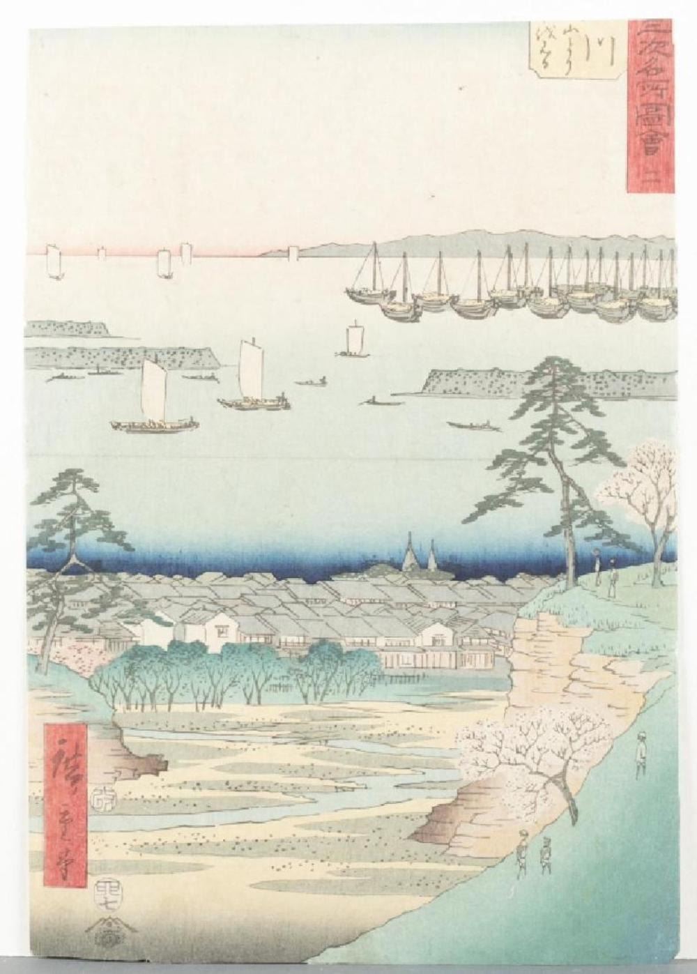 Hiroshige Utagawa (Japan, 1797-1858). No. 2, Shinagawa: View of the Station from Goten-yama (Shinagawa, Goten-yama yori ekijuu o miru), from the series Famous Sights of the Fifty-three Stations (Gojuusan tsugi meisho zue), also known as the Vertical Tokaido. 1855. Oban, approx. 12"h x 8.3/4"w.no margin, FINE CONDITION