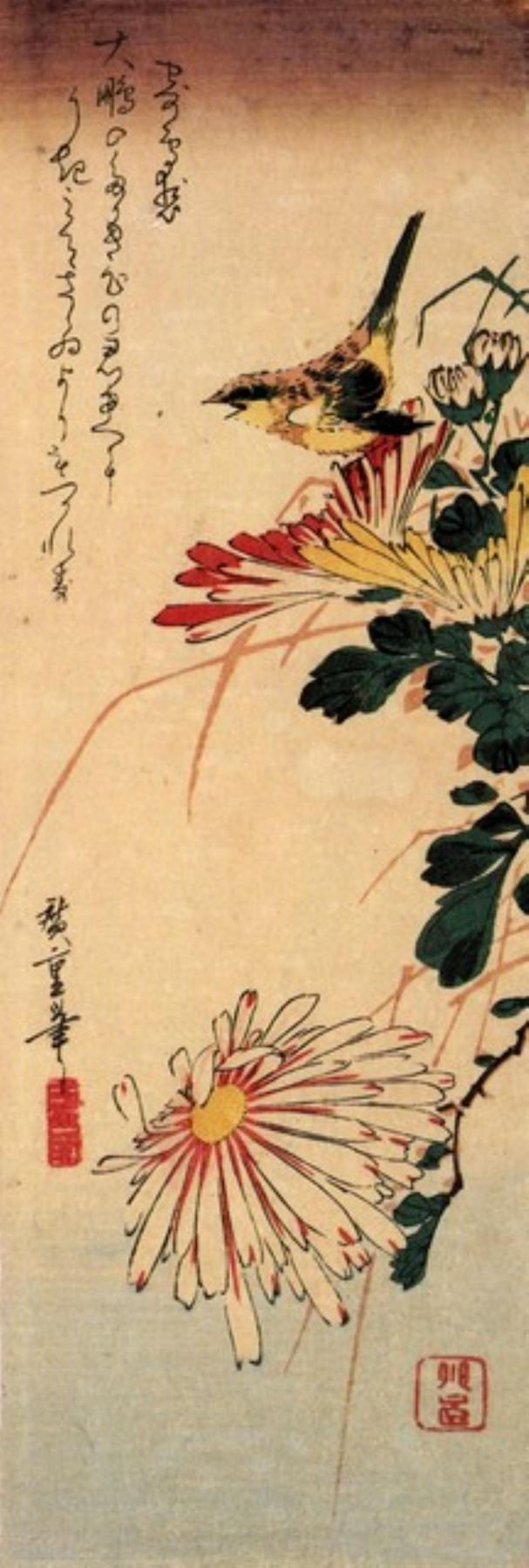 Artist: Utagawa Hiroshige - Title: Small Bird with Chrysanthemum - Medium: Fine Art Giclee on Canvas - Image Size: Approximately 20 inches x 6.75 inches - Unframed on Unstretched Canvas - Biography: (1797 - 12 October 1858) Hiroshige 's print s convey the beauty of Japan and provide insight into the everyday life of its citizens during the Edo period. The appeal of his tender, lyrical landscapes was not restricted to the Japanese audience.Hiroshige 's work had a profound influence on the Impressionists and Post-Impressionists of Europe: Toulouse-Lautrec was fascinated withHiroshige 's daring diagonal compositions and inventive use of perspective, while Van Gogh literally copied two ofHiroshig's prints from the famous series, 100 Famous Views of Edo in oil paint. - The borders may not be even inHiroshig's images. Please refer to the image.