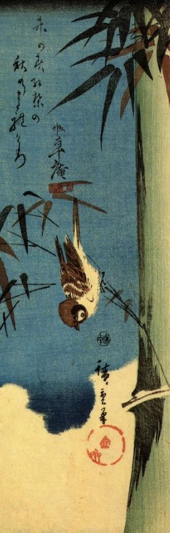 Artist: Utagawa Hiroshige - Title: Sparrow and Bamboo 3 - Medium: Fine Art Giclee on Canvas - Image Size: Approximately 32 inches x 10.25 inches - Unframed on Unstretched Canvas - Biography: (1797 - 12 October 1858) Hiroshige 's print s convey the beauty of Japan and provide insight into the everyday life of its citizens during the Edo period. The appeal of his tender, lyrical landscapes was not restricted to the Japanese audience.Hiroshige 's work had a profound influence on the Impressionists and Post-Impressionists of Europe: Toulouse-Lautrec was fascinated withHiroshige 's daring diagonal compositions and inventive use of perspective, while Van Gogh literally copied two ofHiroshig's prints from the famous series, 100 Famous Views of Edo in oil paint. - The borders may not be even inHiroshig's images. Please refer to the image.