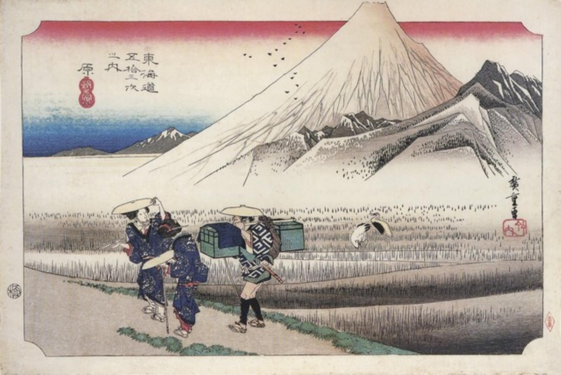 Artist: Utagawa Hiroshige - Title: Travellers Passing Mount Fuji - Medium: Fine Art Giclee on Canvas - Image Size: Approximately 21.25 inches x 32 inches - Unframed on Unstretched Canvas - Biography: (1797 - 12 October 1858) Hiroshige 's print s convey the beauty of Japan and provide insight into the everyday life of its citizens during the Edo period. The appeal of his tender, lyrical landscapes was not restricted to the Japanese audience.Hiroshige 's work had a profound influence on the Impressionists and Post-Impressionists of Europe: Toulouse-Lautrec was fascinated withHiroshige 's daring diagonal compositions and inventive use of perspective, while Van Gogh literally copied two ofHiroshig's prints from the famous series, 100 Famous Views of Edo in oil paint. - The borders may not be even inHiroshig's images. Please refer to the image.