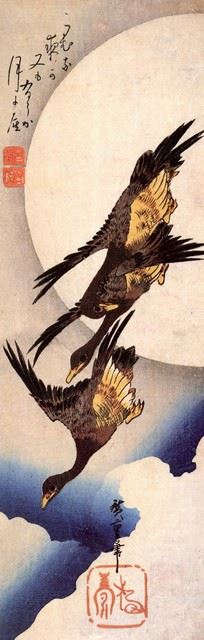 Artist: Utagawa Hiroshige - Title: Wild Geese Flight in Front of the Moon 2 - Medium: Fine Art Giclee on Canvas - Image Size: Approximately 32 inches x 10 inches - Unframed on Unstretched Canvas - Biography: (1797 - 12 October 1858) Hiroshige 's print s convey the beauty of Japan and provide insight into the everyday life of its citizens during the Edo period. The appeal of his tender, lyrical landscapes was not restricted to the Japanese audience.Hiroshige 's work had a profound influence on the Impressionists and Post-Impressionists of Europe: Toulouse-Lautrec was fascinated withHiroshige 's daring diagonal compositions and inventive use of perspective, while Van Gogh literally copied two ofHiroshig's prints from the famous series, 100 Famous Views of Edo in oil paint. - The borders may not be even inHiroshig's images. Please refer to the image.