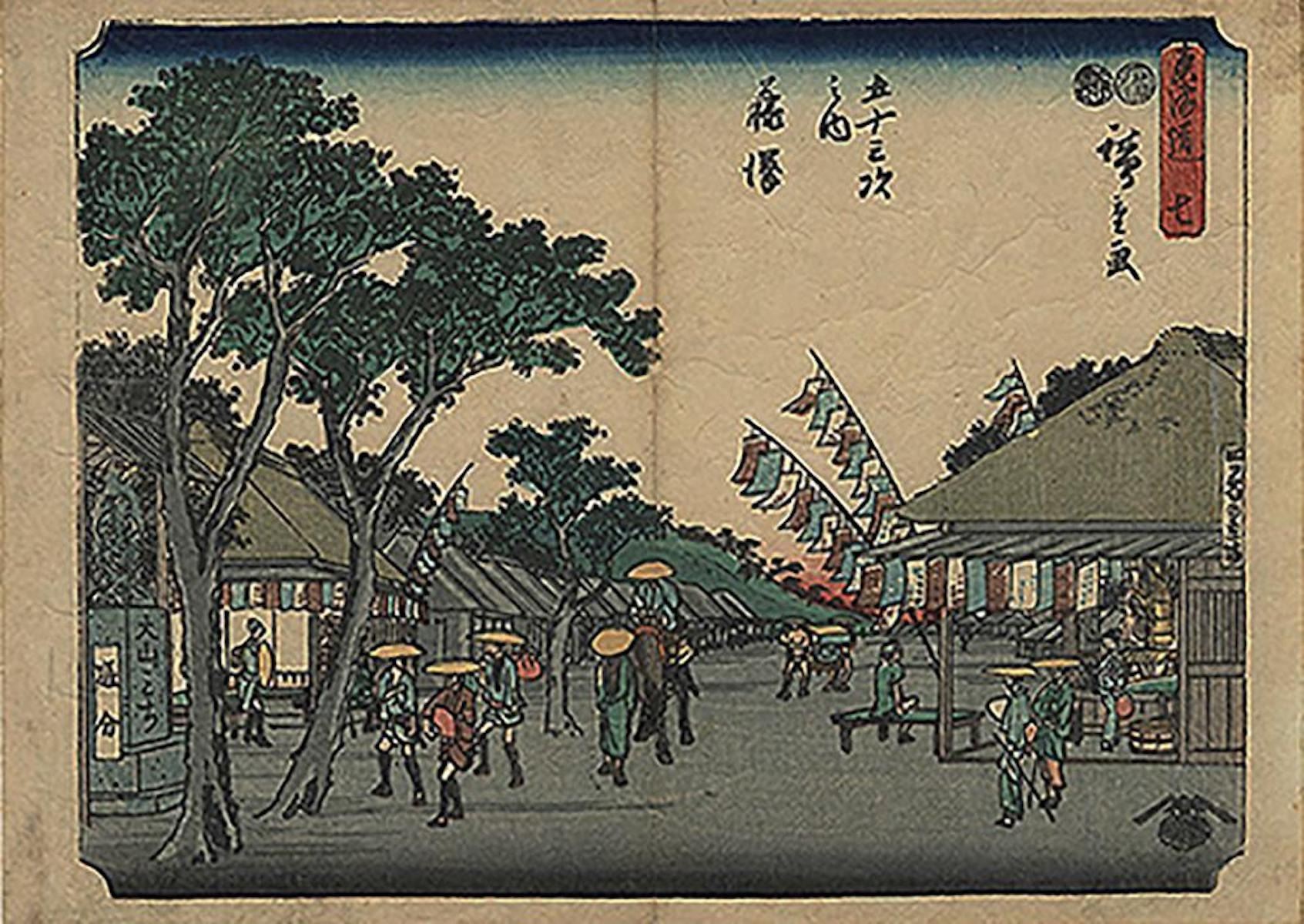 Hiroshige - "Workers Returning to Town", chuban 10 x 7, Center folded, Very good condition
