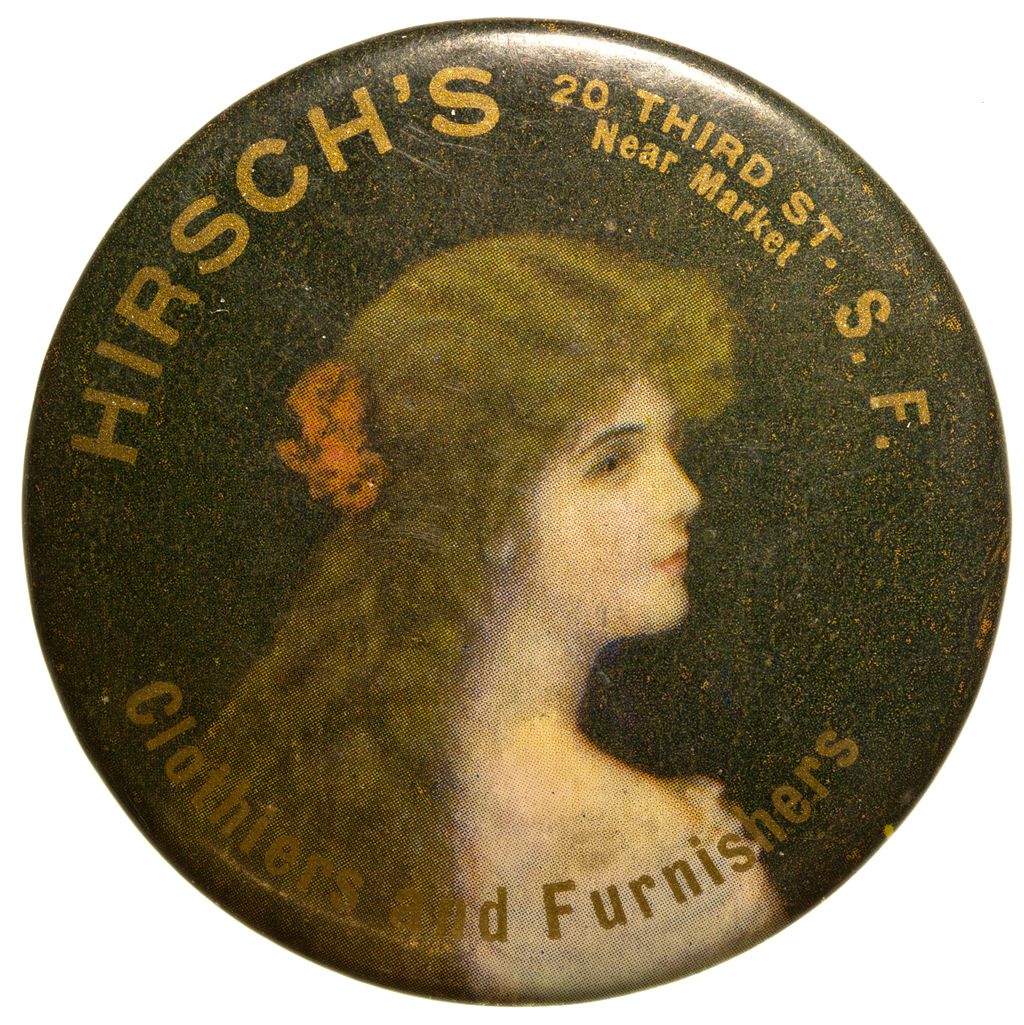 Advertising, redemption | “Mirror with obverse of gold sparkled lettering on whole sided vignette. Image of a fair-skinned brown haired women looking seductively over her right shoulder in light-blue gown occupies obverse. She wears a red hair accessory.”
