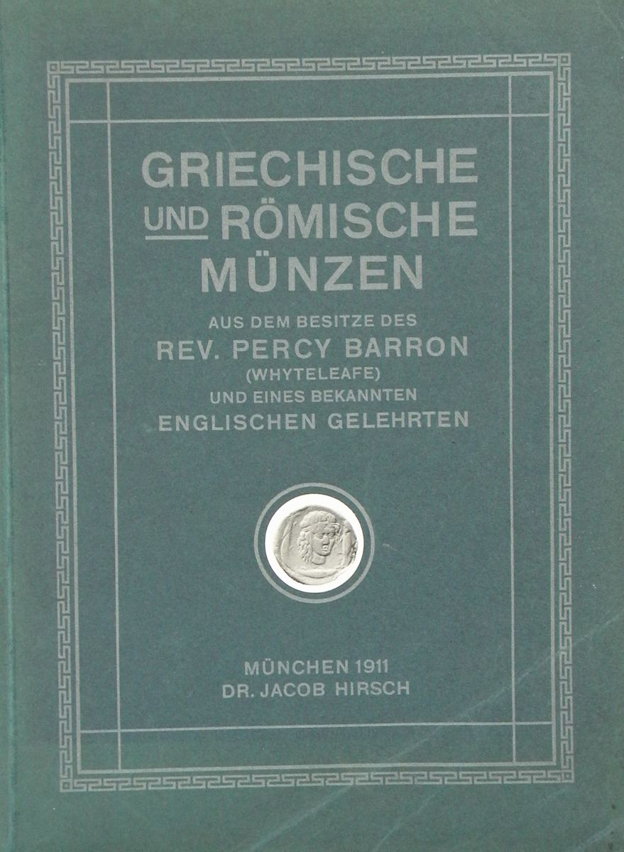 Hirsch, Jacob. GRIECHISCHE UND RÖMISCHE MÜNZEN AUS DEM BESITZE DES REV. PERCY BARRON (WHYTELEAFE) UND EINES BEKANNTEN ENGLISCHEN GELEHRTEN. München: No. XXX., 11. Mai 1911 u. ff. Tage. 4to, original printed card covers with mounted illustration. (4), 103, (3) pages; 1298 lots; 39 fine plates. Corner bump; folds to covers. Very good or better. An important sale. According to Spring, the "englischen Gelehrten" was Arthur Evans. Clain-Stefanelli 1695. Grierson 279. Spring 384 [also listed under "Most important sales of ancient Greek coins" and "Most important sales of Roman Imperial coins"]. Ex Domenico Rossi, with his bookplate.