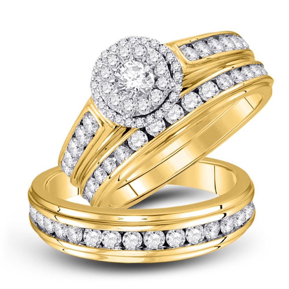 14kt Yellow Gold His Hers Round Diamond Halo Matching Wedding Set 1-5/8 CttwItem Number: GND1495071Gemstone Details1 & 5/8 Carats total weight --- 1/4 carat center solitaire