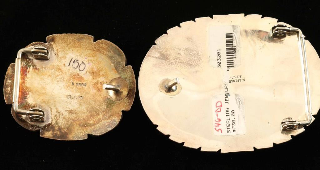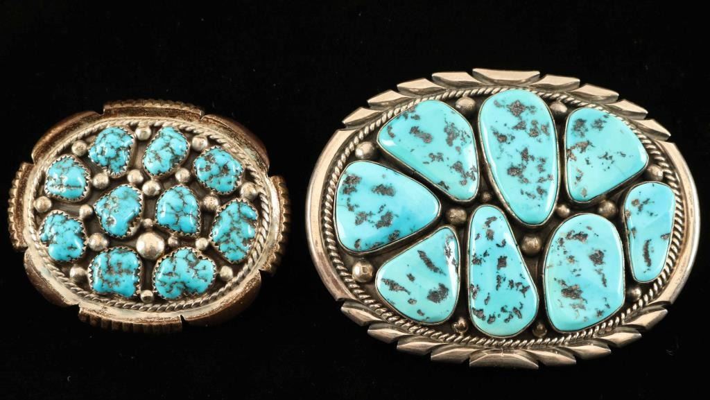 His has eight turquoise stones with bead design measures 2 1/2" x 3 1/4" signed 'M. Spencer' and hers has ten small natural turquoise stones with bead design measures 2" x 2 3/8" signed 'R BRKE'.