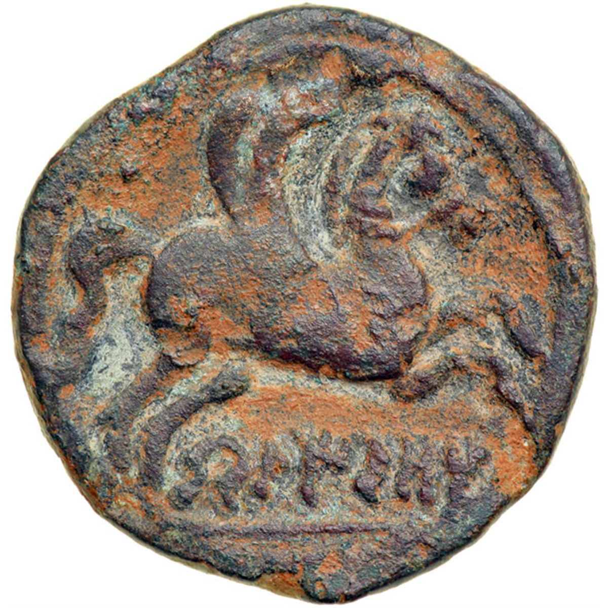 Hispania. Belikiom (Upper Aragon), Late Second Century BC. AE 18. Bearded male head right. Reverse: Pegasos flying right. SNG Cop 323. Choice Very Fine.