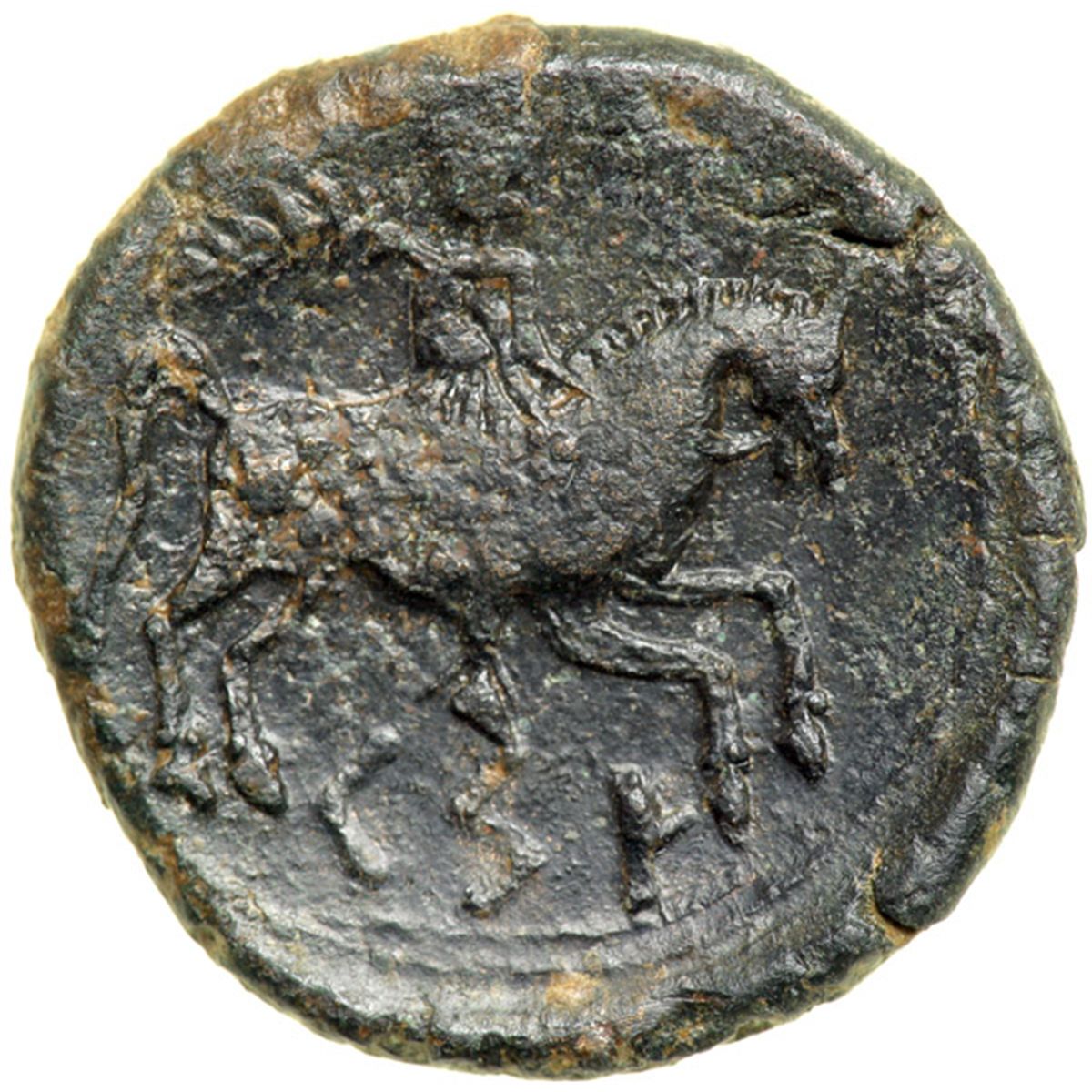Hispania, Tarraco (Kese). The Cosetani, Mid-Second Century BC. AE 24. Beardless male head right. Reverse: Horseman galloping right, holding palm. Cf. SNG Cop 288. Extremely Fine/Very Fine.