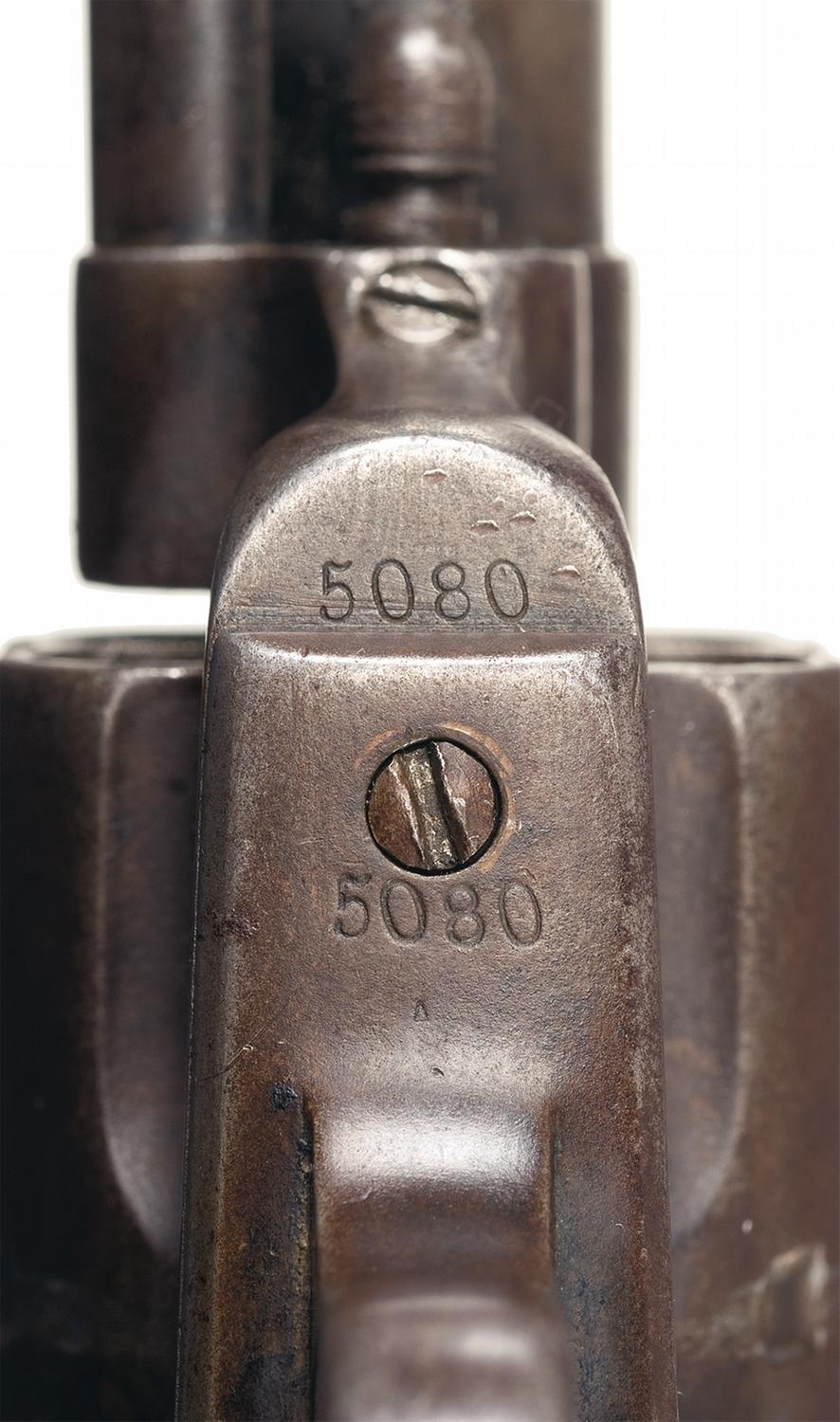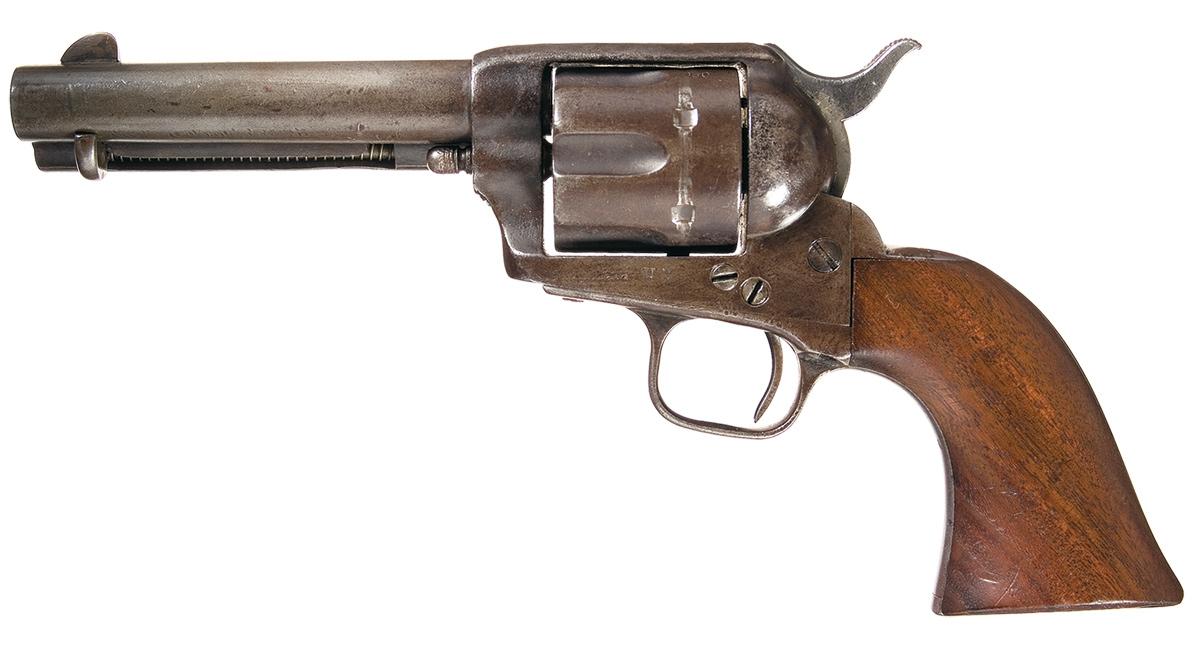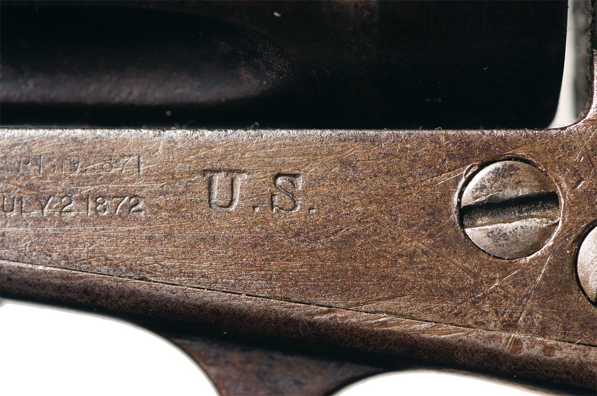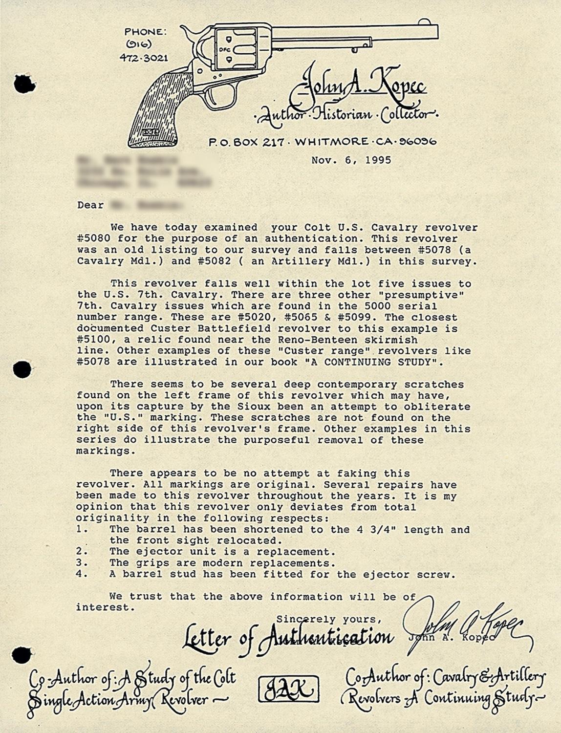 This U.S. Colt Cavalry Single Action Revolver was manufactured in 1874 and inspected by Ordnance Sub-Inspector O. W. Ainsworth. This revolver is accompanied by a letter of authentication by Colt Single Action Army expert John A. Kopec. The letter states that this revolver falls within the serial number range of revolvers known to have been issued to the U.S. 7th Cavalry and carried at the Battle of Little Bighorn. Kopec states that Cavalry Single Action revolvers serial numbers 5020, 5065, and 5099 are "presumptive" 7th Cavalry issues and that serial number 5100 is a documented Custer Battlefield relic found on the Reno-Benteen battlefield. The revolver has the early 'script' address: "+COLT'S PT. F. A. MFG. Co., HARTFORD. CT. U.S.A.+" on the top of the barrel. The left side of the frame is roll stamped with the early, two-line/two-date, patent markings followed by the "U.S." property mark. Light scratches on the side of the frame indicate that an attempt was made to obliterate the property marking. The Kopec letter notes that other revolvers in the 7th Cavalry serial number range have similar defaced markings and that these scratches may have been the result of an attempt by the Sioux to obliterate the "U.S." markings. The serial number. "5080" is stamped on the bottom of the frame, trigger guard and backstrap, and on the side of the barrel and cylinder. Small "P" proofmarks are stamped on the barrel and the side of the cylinder. The distinctive "A" inspection mark of O.W. Ainsworth is visible on the cylinder and on the trigger guard below the serial number. The loading gate is stamped with the assembly number "342". The barrel has been shortened to 4 3/4-inches and the front sight has been moved. The ejector housing and ejector rod head are period replacements and a barrel stud has been fitted for the ejector screw. The one piece walnut grip is a modern replacement. The Kopec letter states that the revolver is completely original except for the ejector assembly and grip. Firearms associated with the Battle of Little Bighorn are among the rarest and most desirable U.S. martial arms. This Ainsworth inspected Colt Single Action Cavalry revolver is definitely in the serial number range of revolvers experts agree were carried by Custer's 7th Cavalry at the Battle of Little Bighorn.