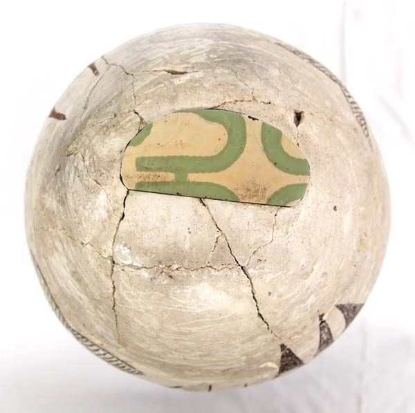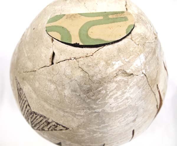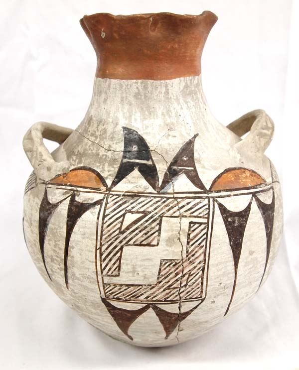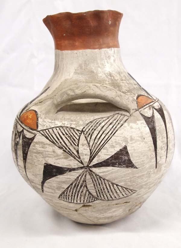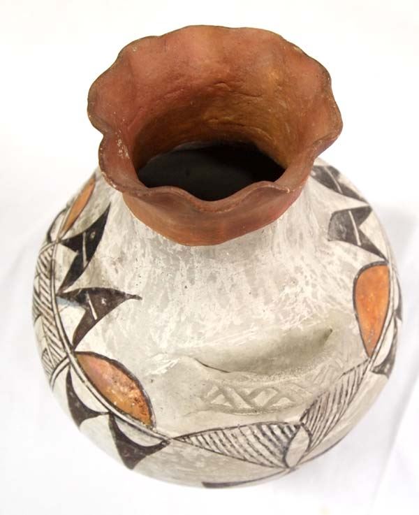 Historic Acoma Zia Birds Pottery Jar, measures 11''T x 8.5''W, has been glued in stationary position, fluted rim, double handled, beautiful piece of historic pottery, 2 small pieces gone near bottom of pot however no holes. Pottery has been glued to a display area, as shown on the bottom