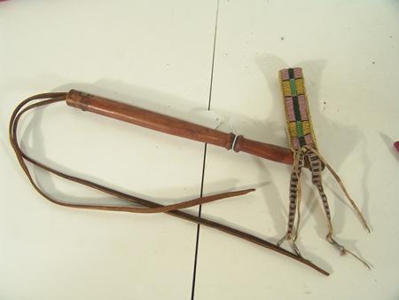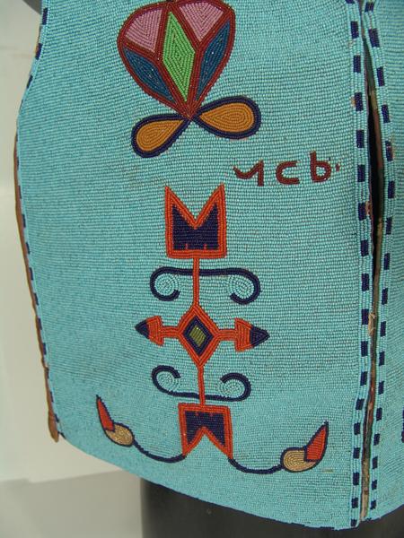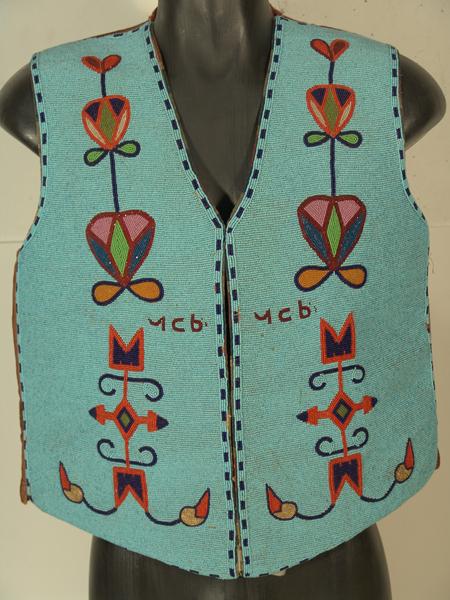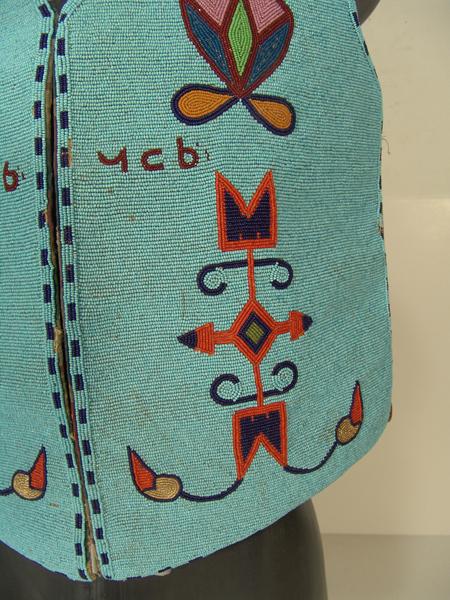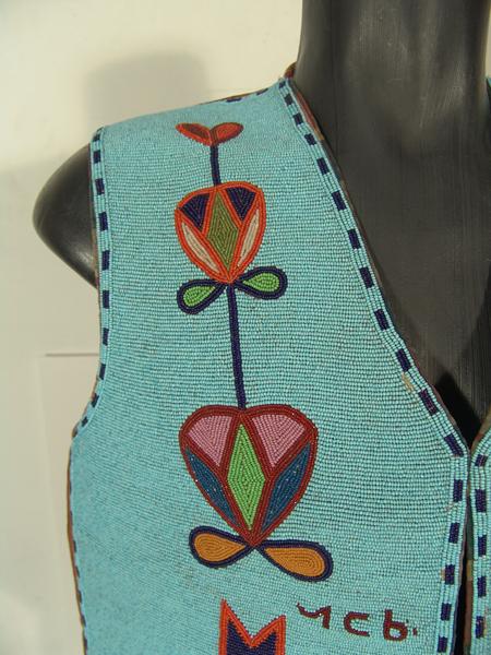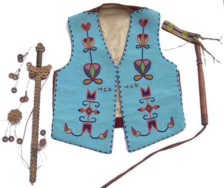 Beautiful, full beaded Cree-made vest with traditional floral motif and Cree alphabet symbols given to and worn by famous Hopi "Judge Hooker" Hongeva. Included in the group is his (Sioux made) quirt and Chinese coin sword. Hooker and all three items are s