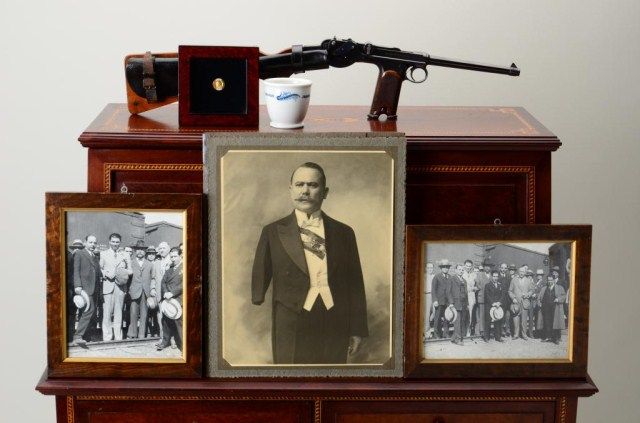 Historic Borchardt 9mm semi-auto pistol with matching shoulder stock, holster, two extra clips manufactured by Loewe of Berlin, #938 obtained by our consignor directly from the grandson of Mexican President Alvaro Obregonwith accompanying family archives and personal effects. General Obregon was one of the principal Generals of the Mexican Revolution; he and Pancho Villa along with Venustiano Carranza and Emiliano Zapatafought the principal battles that freed Mexico from the grip of longtime Dictator, Porfirio Diaz. In 1915, there was a division among the strongest Generals of Mexico and Villa allied himself with Zapata whileCarranza allied himself with Obregon; Carranza was elected President promising Obregon the succession; Carranza and Obregon fell out with each other and Carranza was assassinated. Obregon became the President of Mexico in 1920 and his old friend Pablo Gonzalez became an important General acting on Obregon’s bequest; Gonzalez was a personal favorite of Porfirio Diaz for many years before the Revolution and while Diaz was