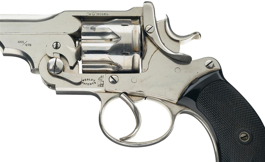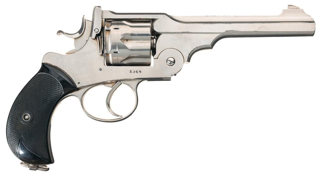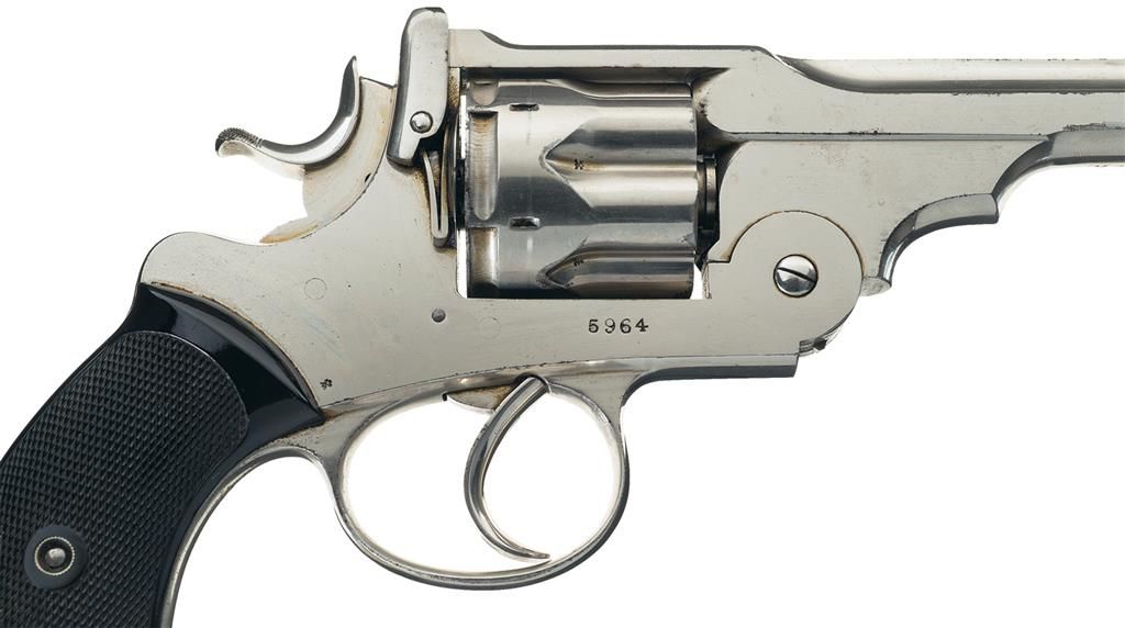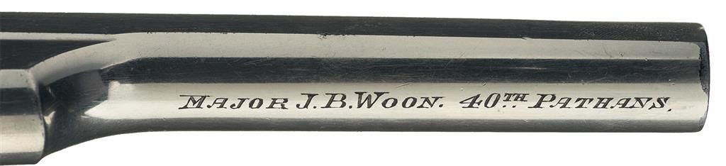 This is a beautiful example of a scarce Model 1892 Webley & Son Army revolver complete with rare engraved personalization on the underside of the barrel and an original English retailer oak case. This beautiful revolver has been personalized on the barrel with the engraving: "Major J. B. Woon 40th PATHANS". This unit, the 40th Pathans was an infantry regiment of the British Indian Army and was raised or established in 1858, as the Shahjehanpur Levy. It was designated as the 40th Pathans in 1903 and became 5th Battalion (Pathans) 14th Punjab Regiment in 1922. Major J. B. Woon served in this unit and later became Lieutenant General. In 1947 the unit was allocated to the Pakistan Army, where it continues to exist as 16th Battalion of the "The Punjab Regiment". From the start this unit served in numerous battles and engagements in the Far East up and through World War II for the British Empire. Although there is very limited information on Major Woon and his roll with this unit a through additional search could glean far more information on Major Woon and his entire service record. The barrel rib is marked, "P. WEBLEY & SON. LONDON & BIRMINGHAM" with the left side of the barrel marked "455/476", with a standard fixed blade front sight and fixed rear sight. The left side of the top trap of the frame is roll stamped "WG MODEL" with the lower frame area stamped, "WEBLEY/PATENTS" followed by the "Winged Bullet/W&S" trademark. The right side of the frame is stamped with serial number, "5984" with the rear of the cylinder stamped "964" and "8" between the chambers. This revolver still retains the early "Church Steeple" style cylinder flutes. The frame has a birds head style grip used on these early models and is fitted with checkered vulcanite rubber grips with a lanyard loop on the butt. It comes with a oak storage/display case with poplar wood bottom with brass reinforcing screws on the lid and base. The top of the lid has a round brass escutcheon plate inlaid in the center that is engraved "F. H./24th Regiment". If you know your history this was the "24th Foot" infantry Regiment, which was another historic British unit that was involved in numerous battles throughout the world; most notability was during the ZULU wars in 1879/1880; specifically at Isandhlwana on 22nd Jan, 1879 and also at Rorke's Drift, 22nd-23rd Jan 1879. The case is lined with navy blue fabric and has six compartments including a 30 round cartridge block, (no ammunition included) which includes a brass cleaning rod, a small square glass oil container with a silver lid and a walnut handled screwdriver. Certainly this revolver and case are worth doing considerable detailed historical research.