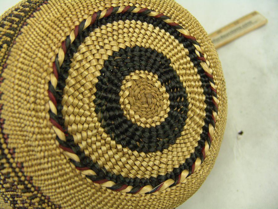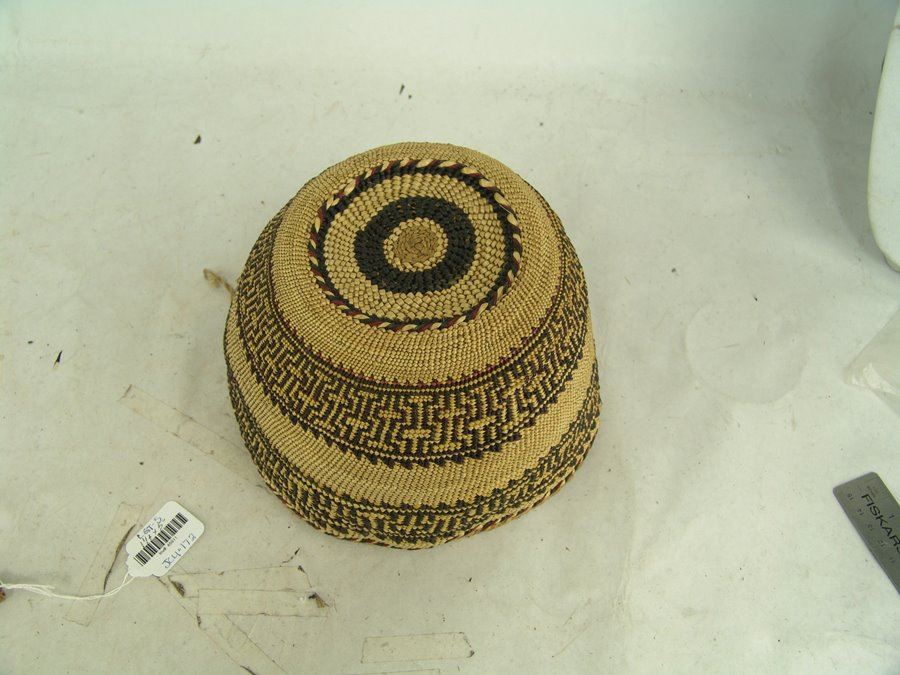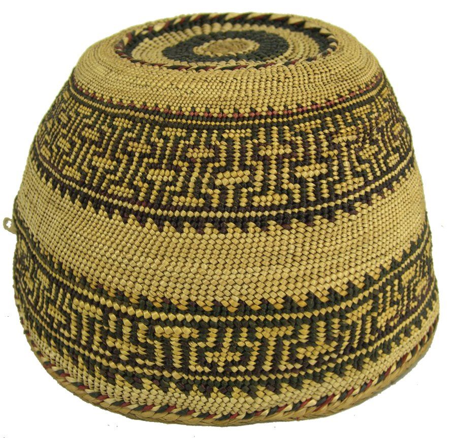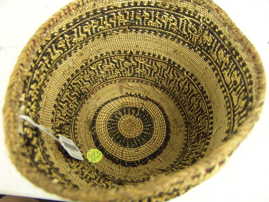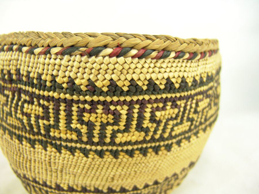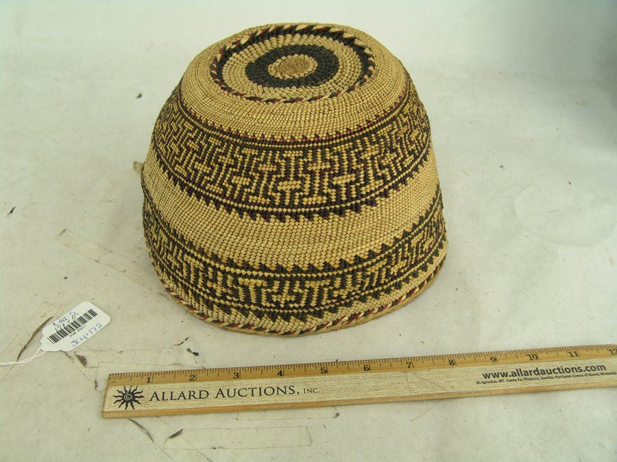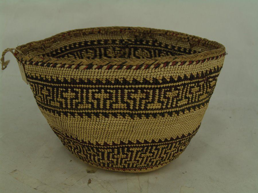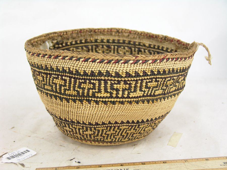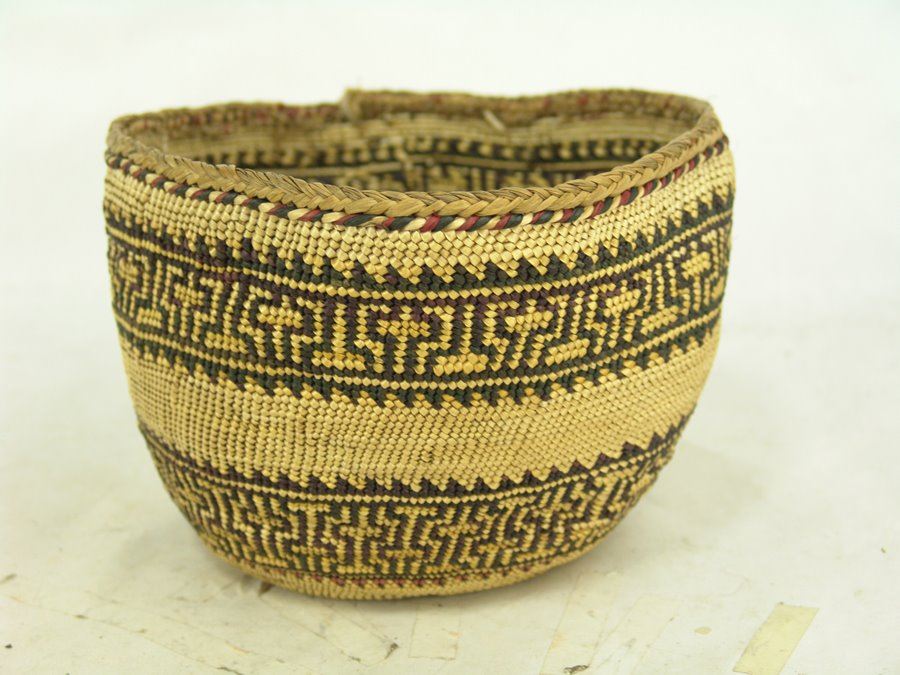 Beautiful fine weave, historic basket with double geometric bands. From the famous Tokeland Hotel collection, Tokeland, Washington. With original collection clasp tag, very good condition.,Early 1900s,5 1/2" x 9"