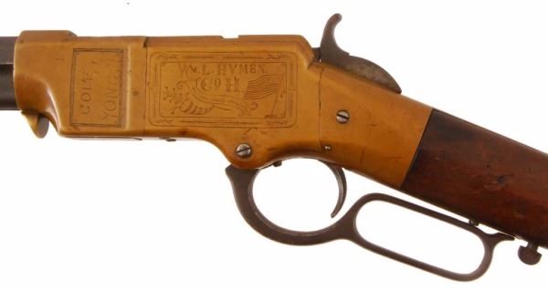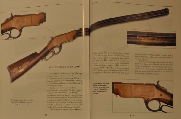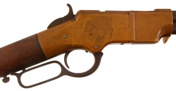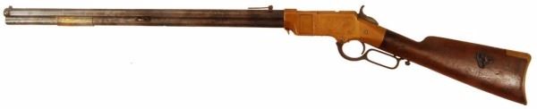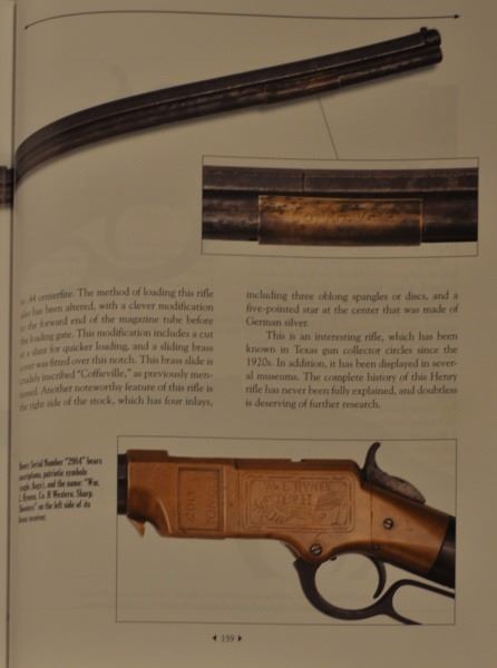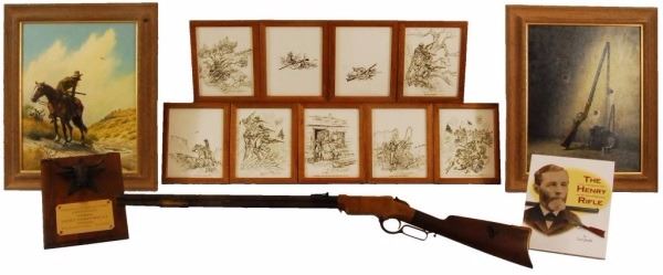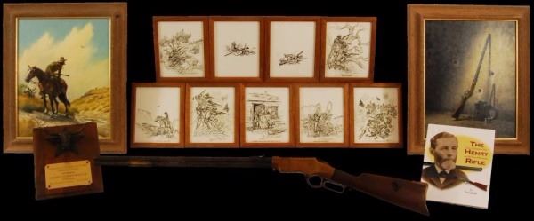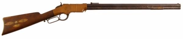 1860 Henry rifle, #2984, period engraved "Wm. L. Hymen, Co. H. Western Sharpshooters", showing cornucopia with American flag surrounded by light foliate borders, right side of frame engraved with American eagle clutching arrows and American flag, front left of frame is inscribed "Cole Younger" in crude non-professional script letters which are old, also a brass cover mounted to the barrel area of magazine tube is engraved in similar block letters "Coffieville". This particular rifle is picture on Page 46 of "The Winchester Book", by Madis, and a letter from Patrick Wagner traces the history of this Henry rifle back to the Edwin Wolters Memorial Museum in Shiner, TX. Another letter signed by Julius Wolters Hollmann mentions that the rifle was obtained by Edwin Wolters for his museum in the 1920's where the rifle was won in a Schutzenfest in Cat Springs, Texas. Also a letter from famous Texas gun collector Gaines deGraffenreid documents the acquisition of this Henry rifle from Edwin Wolters and the fact that he allowed it to be pictured in "The Winchester Book" in 1961. Barrel shows a gray/brown patina finish with light to moderate scattered surface pitting and erosion with slightly heavier pitting on the edges and top of barrel and scattered about, but generally fair to good overall, with barrel address mostly visible; frame shows a deep patina and is good to very good with minor dings, mars, scratches and carry marks; stock is good showing four inlays in the right buttstock, three oblong spangles or discs, and a five-pointed star at the center which is German silver: stock shows some weathering, small losses, even wear, carry, several picks and gouges, but generally good overall; buttplace shows a matching patina to the frame; hammer, trigger and lever also show a deep and dark patina; barrel collar has been period changed, rifle converted to .44 CF, and a removable brass plate has been installed ingeniously at the joint of the barrel protecting an enlarged opening which is cut out of the magazine to facilitate loading without turning the barrel. It is interesting that the name "Cole Younger" is misspelled "Cole Yonger". Cole Younger, the outlaw, was a member of the Quantrill gang and rode with the outlaw brothers Frank and Jesse James. Also, "Coffieville" is a misspelling of "Coffeyville". The connection of Yonger or Younger to Coffeyville is not known. There is some knowledge of the Younger brothers spending time with their sister in Texas who kept her identity and location unknown as the outlaws were probably hiding out there. The Western Sharpshooters were a Civil War special forces unit used as skirmishers and snipers and accompanied Sherman on his march to the sea where they also acted as bodyguards to the person of Gen. Sherman. William Hymen, the original owner, was wounded near Dallas, Georgia, on the campaign to Atlanta. Company archives information confirms Hymen's service in the 66th Ill. Infantry. This rifle has been known in Texas collector's circles since the 1920's and has been displayed by the Edwin Wolters Memorial Museum, Shiner, TX; the Heritage Society Gallery of Texas History, Houston, Texas; and the Ft. Fisher Ranger Museum, Waco, TX. A very interesting Henry rifle whose complete history has never been completely explained and bears further research. Less than ten Western Sharpshooter engraved Henry rifles are known to knowledgeable Civil War collectors. Winner of most Historical Display at this Fall's T.G.C.A. Show -- 2008. Comes with 9 Original Pen Inks and 2 Original works of art entitled "Henry At Rest" and, "Respect For The Henry".