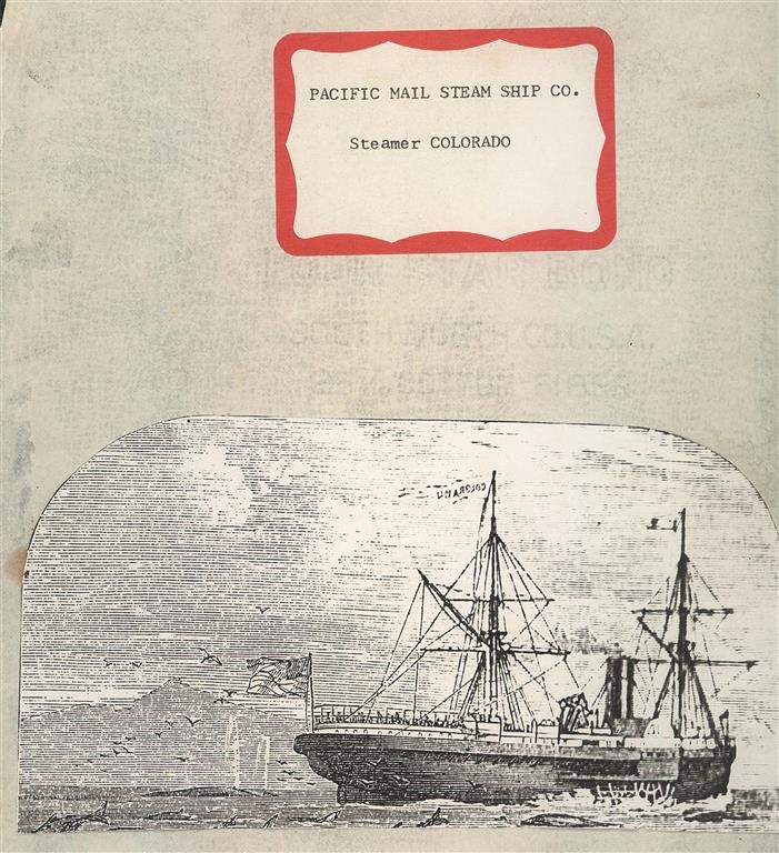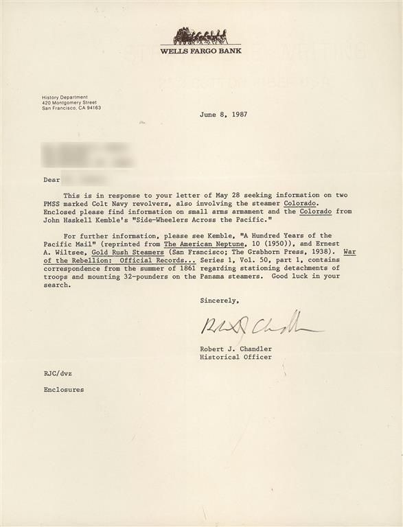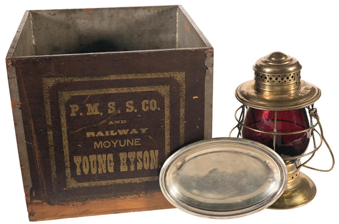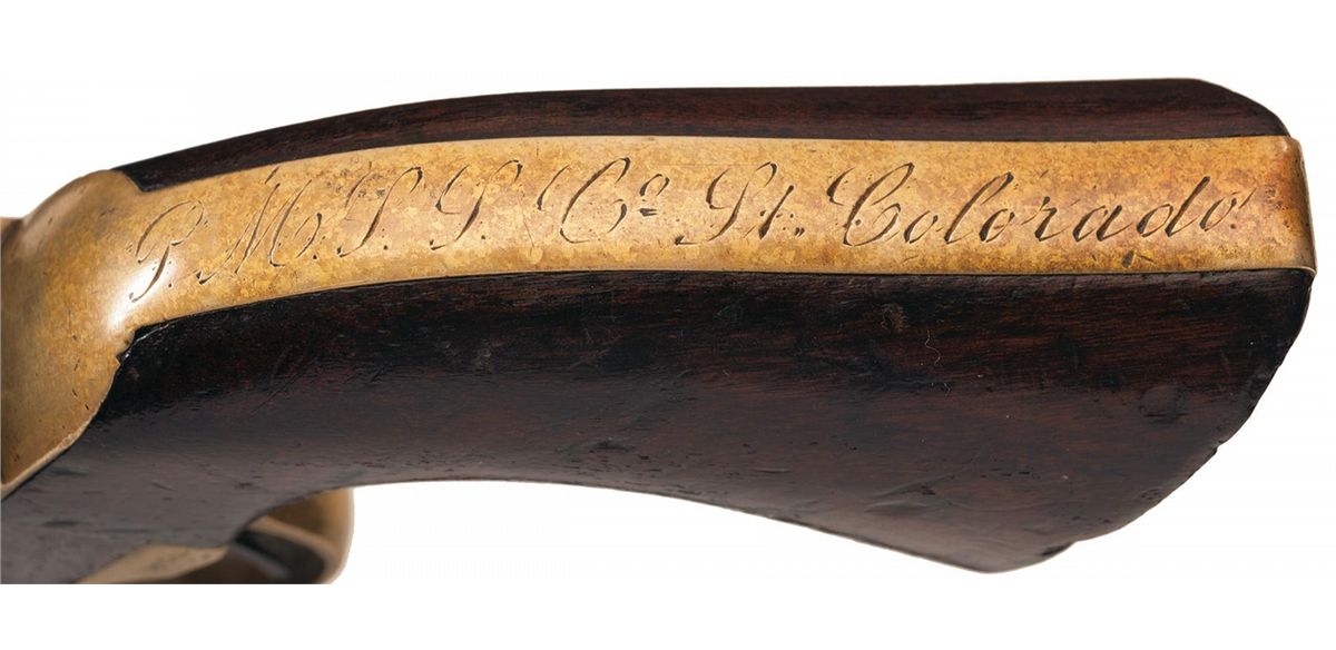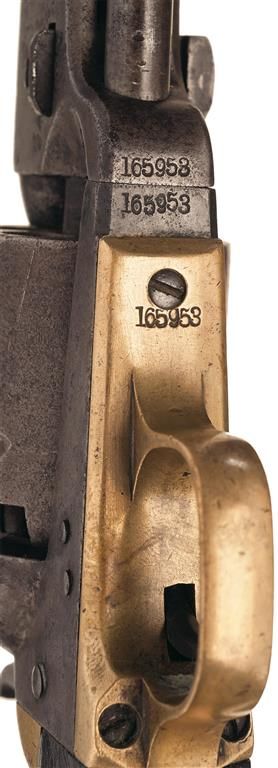 This Colt Model 1851 Navy was manufactured in 1863. The commercial Fourth Model Navy revolver has the distinctive large rounded trigger guard, capping channel in the recoil shield cut-out, and thin contour loading lever catch. The revolver blackstrap is inscribed "P.M. S.S. Co. St. COLORADO" (Pacific Mail Steam Ship Co. Steamer Colorado) in script letters. The Pacific Mail Steam Ship Co. pioneered steamship service to California in 1847 and established regular mail and passenger service between New York and California during the 1850s and 1860s. On January 1, 1867, the steamship Colorado left San Francisco bound for Japan and arrived in Yokohama, following a 22-day voyage. This voyage initiated regular steamship service between San Francisco and the Orient. In addition to the inscription on the blackstrap, the regular Colt markings on the revolver include: the one-line legend "-ADDRESS COL. SAML COLT NEW-YORK U.S. AMERICA-" on the top of the barrel, "COLTS/PATENT" in two lines on the left side of the frame, "36 CAL" on the shoulder of the trigger guard and "COLTS PATENT" and the Texas Navy battle scene on the cylinder. The full serial number "165953" is stamped on the bottom of the barrel lug, frame, trigger guard and blackstrap. The cylinder is stamped with the partial serial number "6586". No serial number is visible on the loading lever. Included with the revolver is a brass railroad style lantern embossed, "PMSSCo" on the top, a Reed & Barton silver serving tray engraved "PMSSCo" and a wooden tea chest with the legend "P.M.S.S.CO./AND/RAILWAY/MOYUNE/YOUNG HYSON." in gold letters. A spiral bound collection of research pertaining to the history of the steamer Colorado is also included. Other Model 1851 Navy revolvers inscribed to Pacific Mail Steam Ship Co. ships are known and include serial number 140656 inscribed to PMSSCo Golden City and serial number 182196 inscribed to PMSSCo Constitution (see the book COLT'S HISTORY AND HEROES by John G. Hamilton, pg 39).