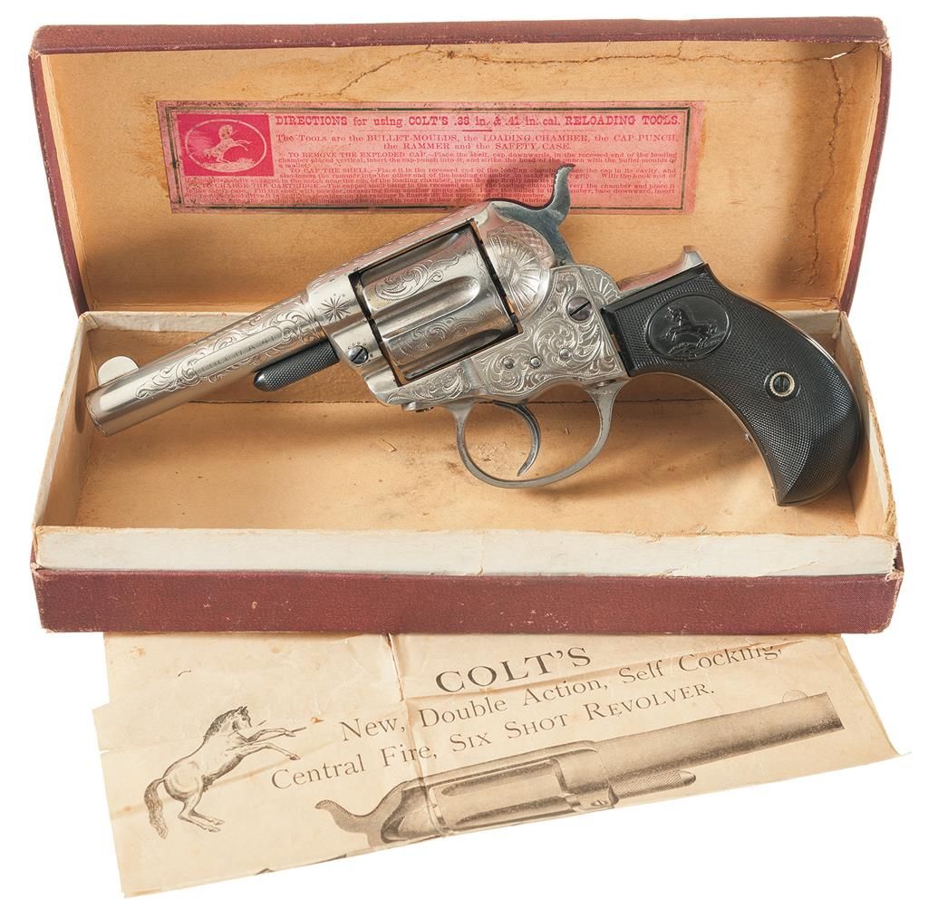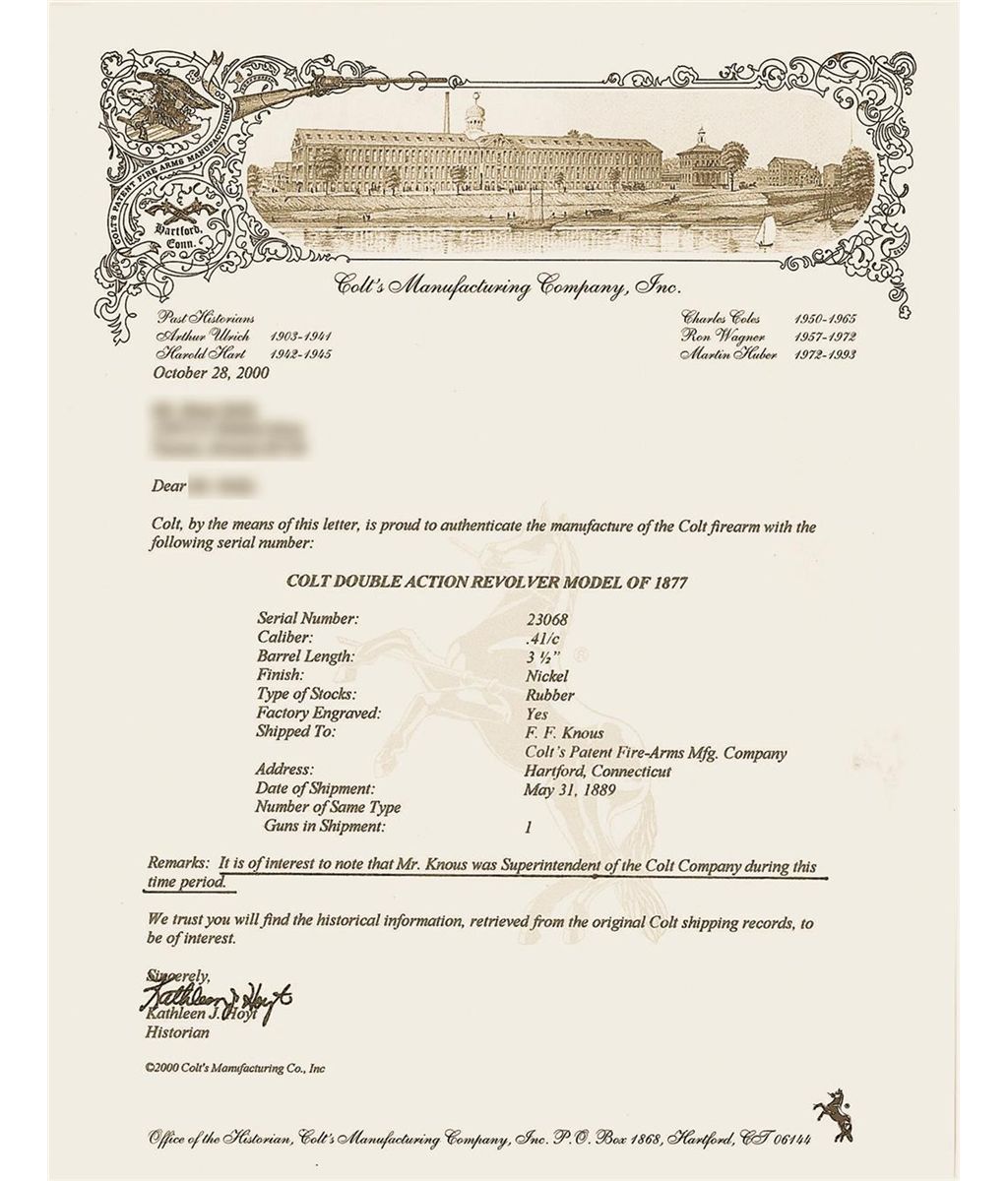 Manufactured in 1889. The revolver is complete with a Colt factory letter that lists the revolver features as: "Caliber: .41/c, Barrel Length: 3 1/2", Finish: Nickel", and "Type of Stocks: Rubber". The letter states that the revolver was factory engraved and indicates that it was shipped to "F.F. Knous, Colt's Patent Fire-Arms Mfg. Company, Hartford, Connecticut" on May 31, 1889. The letter further states that "Mr. Knous was Superintendent of the Colt Company during this time period". The revolver has a nickel plated finish with fire blue ejector rod head, frame screws, trigger and hammer top. The two piece checkered bird's head grips are black hard rubber and have the Rampant Colt trademark embossed in an oval at the top. The top of the barrel is roll stamped with the two-line legend "COLT'S PT. F.A. MFG. Co/HARTFORD CT. U.S.A." surrounded by an engraved double-line panel. "COLT D.A. 41" is acid etched in an oblong panel on the left side of the barrel. The Colt "1871", "74 and "75" patent dates are roll stamped in three lines on the left side of the frame. "41 Cal" is stamped on the left rear trigger guard bow. The assembly number "886" is stamped on the inside of the loading gate. The full serial number, "23068" is roll-stamped on the bottom of the frame, trigger guard and bottom of the bird's head grip. The partial serial number "068" is visible on the inside of both grips. The revolver is engraved with Germanic scrollwork on a punch dot background with double line borders. The engraving approximates what Colt later designated "Style 2" or "B" engraving. The engraving was probably executed by Cuno A. Helfricht or his staff. Cuno Helfricht was Colt's Chief Engraver in 1889. The revolver is complete with the very rare "picture" carton. The carton lid has a detailed picture of a Model 1877 D.A. revolver and is labeled "COLT'S DOUBLE ACTION PISTOL/.41 Caliber/ 3 1/2 INCH BARREL". A black and white "ENGRAVED" label is glued to the left side of the lid. The serial number, "23068" is faintly marked on the bottom of the carton. A pink label entitled: "DIRECTIONS for using COLT's .38 in. & .41 in. cal RELOADING TOOLS" is glued to the inside of the carton lid. The carton is complete with the original tissue paper instruction sheet and a wire cleaning brush. Also included with the revolver are copies of patents issued to Franklin F. Knous.