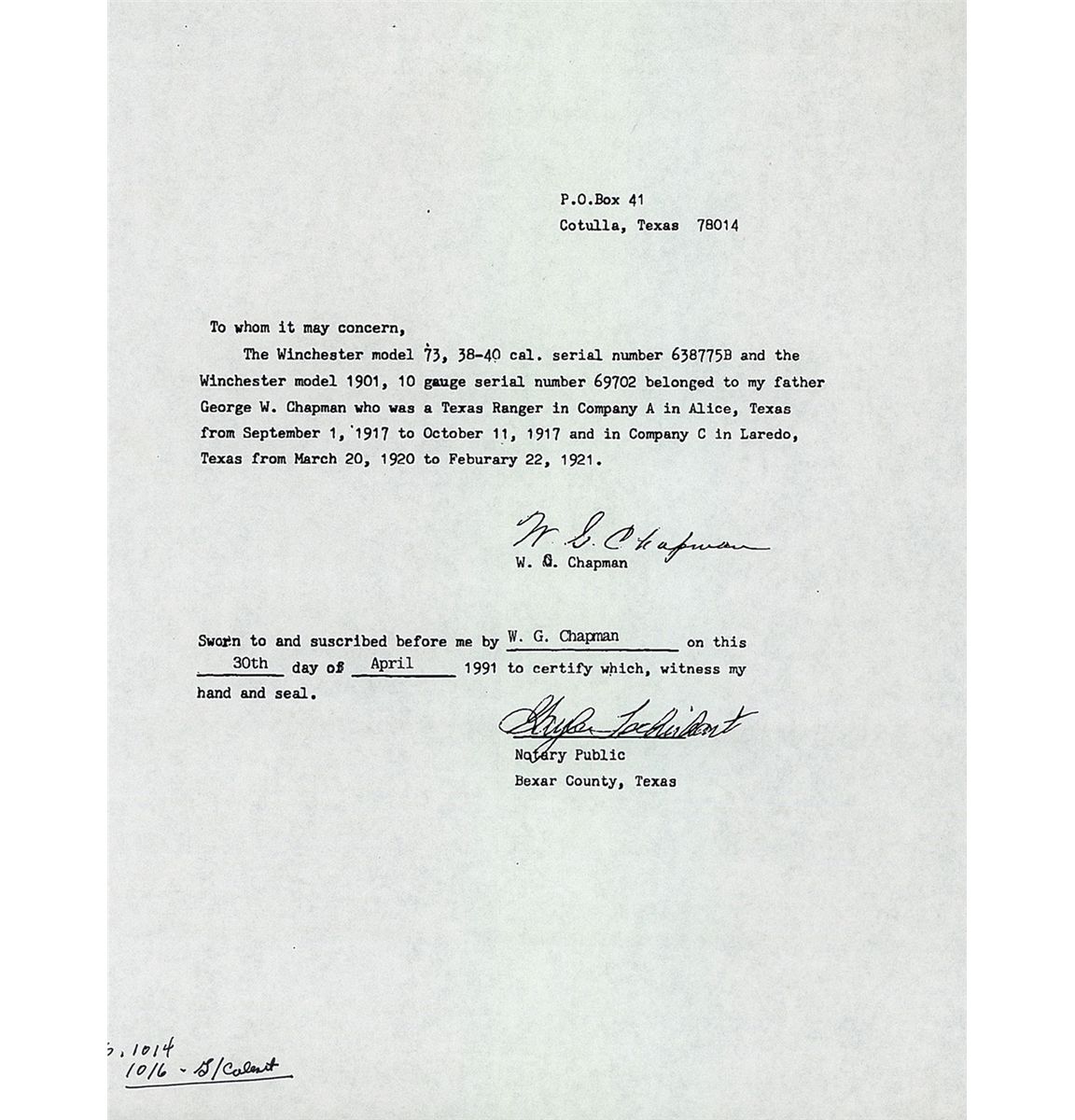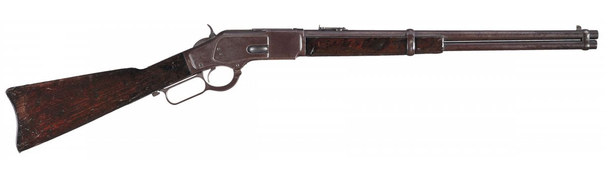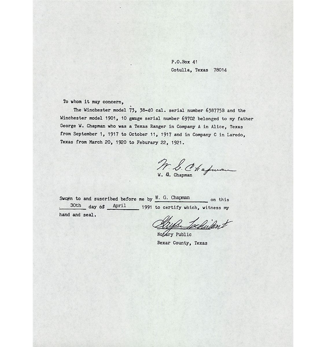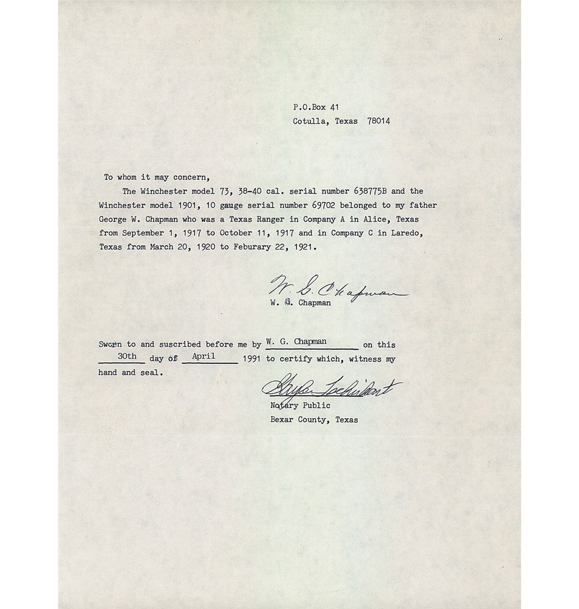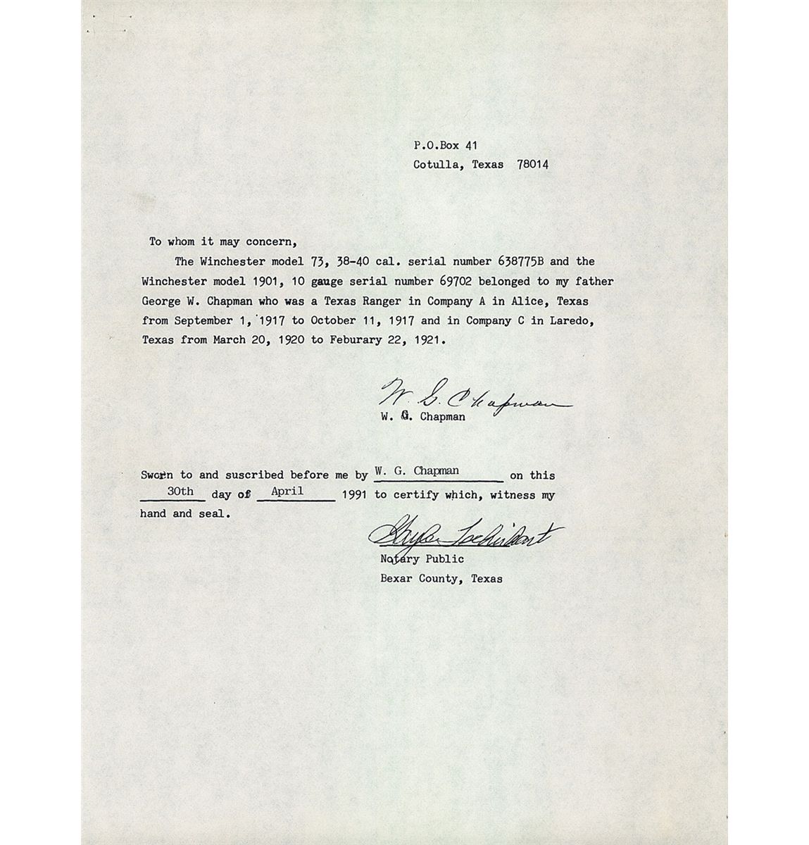 Manufactured in 1910 this is a Third Model carbine with dust cover rail integrally machined as part of receiver. Blade and ladder sights with full length magazine and saddle ring. Two line address/patent dates marking ahead of the rear sight, "38 W.C.F." at the breech and factory proof on top of barrel and receiver. Upper tang has the three line model/trade mark information. Smooth forearm and straight grip stock with trapdoor buttplate. Included is a notarized letter from W.G. Chapman that lists this carbine by serial number as once belonging to Chapman's father, George W. Chapman. George W. Chapman was a Texas Ranger in Company A in Alice, Texas, from September 1, 1917 to October 11, 1917 and in Company C in Laredo, Texas, from March 20, 1920 to February 22, 1921. Also included are copies of official records confirming that George Chapman was a Texas Ranger.