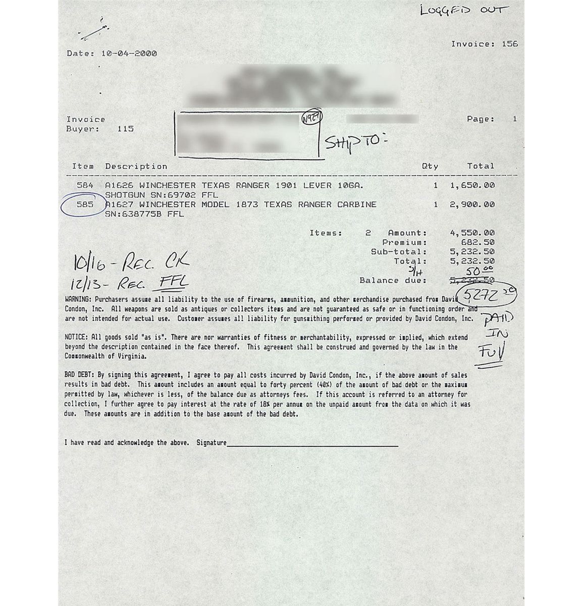Each purchaser at this auction grants us a security in the property purchased. We may retain as collateral security for the purchaser’s obligations to us any of the purchaser’s property and all monies held or received by us. We may apply against such obligations monies held or received by us for the account of, or owing to, the purchaser. We retain all rights of a secured party under the Illinois Commercial Code. Whenever the purchaser pays only a part of the total price for one or more lots purchased, we may apply such payments, at our sole discretion, to the lot or lots we choose. Payment will not be deemed made in full until we have collected all amounts due in cash on good funds (by our definition). If the conditions of sale are not complied with, in addition to remedies available to us and the consignor by law, we hold the purchaser liable for the purchase price, 15% buyers premium, and applicable sales tax, we at our option may either (1) cancel the sale, retain as liquidated damages all payments made by the purchaser or (2) resell the property either publicly or privately, and in such an event the purchaser shall be liable for the payment of any deficiency plus all costs and expenses of both sales and our commission at our standard rates. The purchaser is also responsible for all other charges due hereunder attorney’s fees and incidental damages, etc.