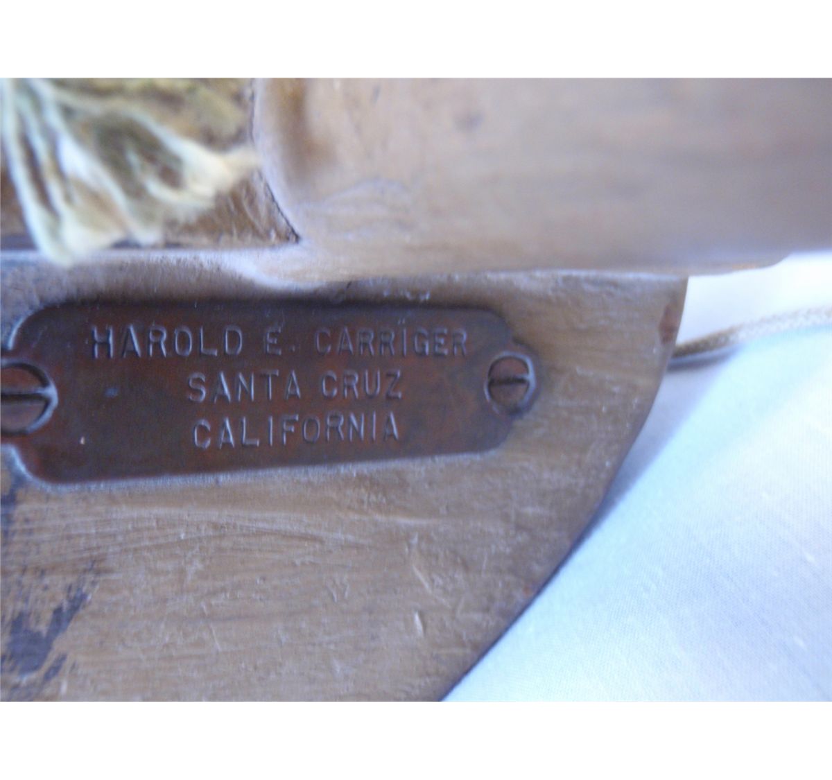 Wooden, Butt-up floating, duck decoy. Original lead weight. Hand painted. Brass Plaque on bottom with engraved with: "Harold E. Carrriger Santa Cruz, California" Measures: 13" x 5 1/4" x 4 3/4" Shipping on this lot: $15.00. Additional Shipping Charges for Lots sent outside of the U.S