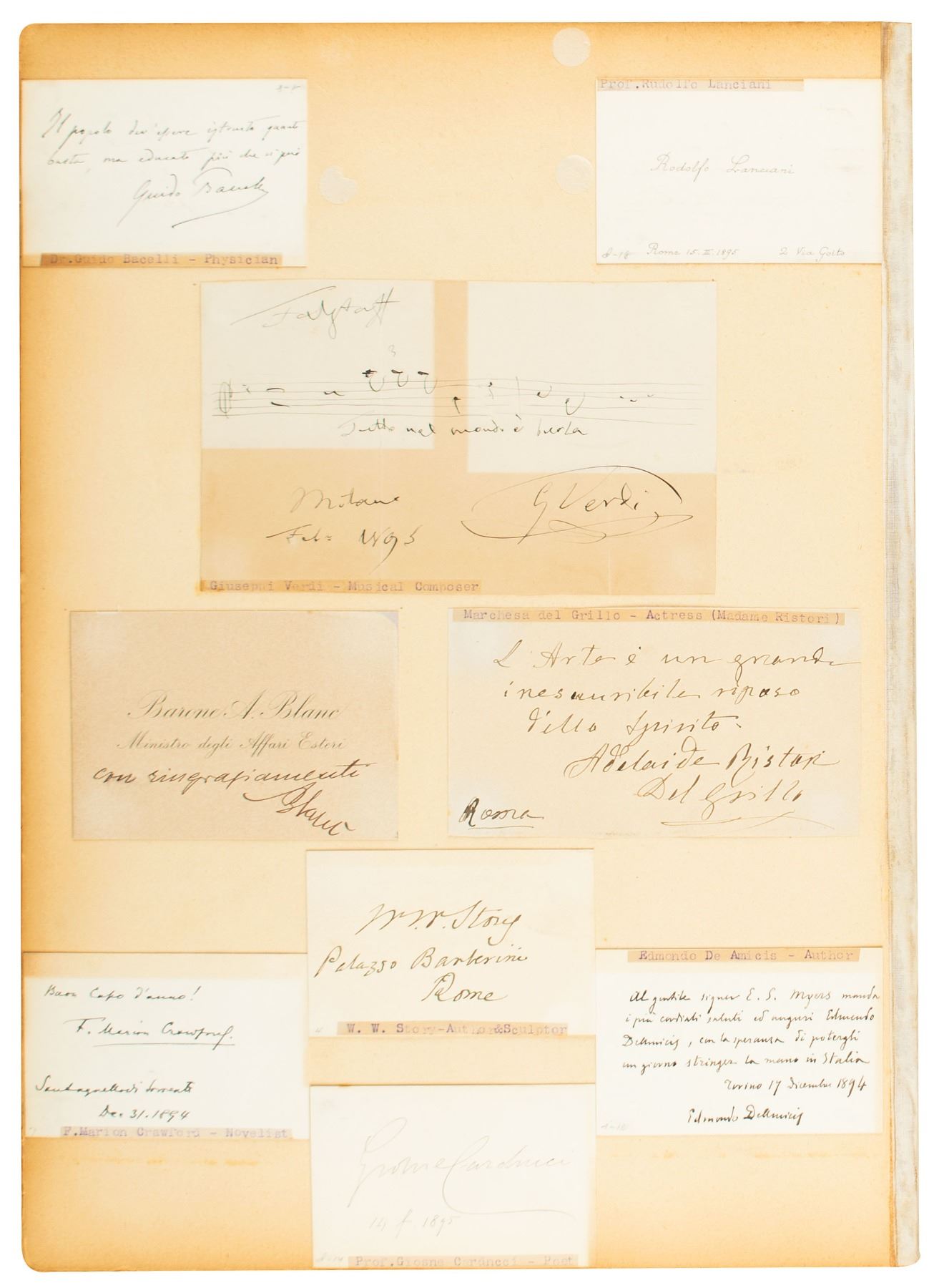 Large and impressive autograph album, measuring 12 x 15, containing approximately 570 autographs affixed inside of notable 19th century figures from a wide variety of fields, highlighted by Alexander Graham Bell, Thomas A. Edison, Ernst Haeckel, Henrik Ibsen, Ferdinand de Lesseps, Louis Pasteur, Theodore Roosevelt, Henry Morton Stanley, Harriet Beecher Stowe, Leo Tolstoy, Mark Twain, Giuseppe Verdi (AMQS from "Falstaff"), and Jules Verne. Other especially noteworthy signers are Andreas Achenbach, Edmondo de Amicis, Susan B. Anthony, George Bancroft, Clara Barton, William Holbrook Beard, P. G. T. Beauregard, Arnold Böcklin, Georg Brandes, Benjamin Butler, Daniel Butterfield, George W. Cable, Giosue Carducci, Andrew Carnegie, Frederick Stuart Church, Grover Cleveland and his cabinet, Ernst Curtius, Felix Dahn, Varina Jefferson Davis, Frederick Douglass, Alexandre Dumas fils, Jubal Early, Marie von Ebner-Eschenbach, Kuno Fischer, Karl Emil Franzos, R. L. Gatling, Wade Hampton, Benjamin Harrison and his cabinet, Rutherford B. Hayes and his cabinet, Paul Heyse, Oliver Wendell Holmes, Joseph Dalton Hooker, Julia Ward Howe, William Dean Howells, Sarah Ornett Jewett, Jacques comte de Lalaing, Fitzhugh Lee, Frederick Leighton, Queen Liliuokalani, Robert Lincoln, Paul Lindau Henry Cabot Lodge, James Longstreet, Joseph McKenna, William McKinley, Nelson A. Miles, Giulio Monteverde, Josef Myslbeck, Adolf Erik Baron Nordenskiöld, David D. Porter, Ernst Possart, Joseph Pulitzer, Frederick Remington, Cecil Rhodes, Adelaide Ristori Del Grillo Capranica, W. S. Rosencrans, J. M. Schofield, William T. Sherman, Henri de Saussure, Friedrich Spielhagen, Elizabeth Cady Stanton, Johann Strauss II (AMQS), Sully Prudhomme, Ambroise Thomas (AMQS), C. D. Tiffany, Mary E. Walker, Lew Wallace, and Anton von Werner. Also includes statesmen and diplomats from Great Britain, Iceland, Mexico, Cuba, Venezuela, Argentina, Portugal, Russia, Japan, Hawaii, and China. In very good to fine condition, with partial separation to the album's cover, and irregular toning to most of the signature.